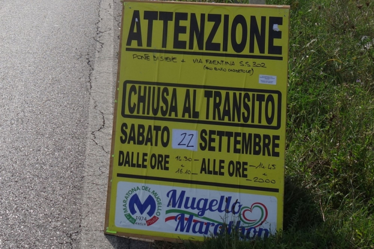 Auf der Straße ist eine grüne Linie aufgemalt, zudem weisen Pfeile auf Abzweigungen hin. Und es gibt reichlich Streckenposten. Nach Km 4 verlassen wir die SR 302. Es geht nach einer Brücke über den Fiume Faltone rechts ab auf die SR 65 Richtung San Piro a Sieve und Scarperia. Die Kreuzung ist mustergültig abgesperrt.