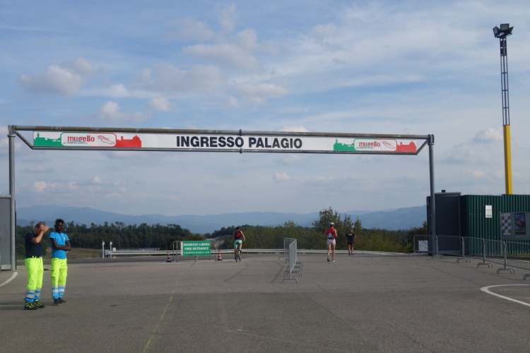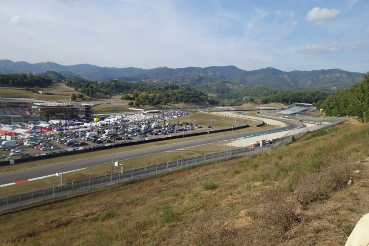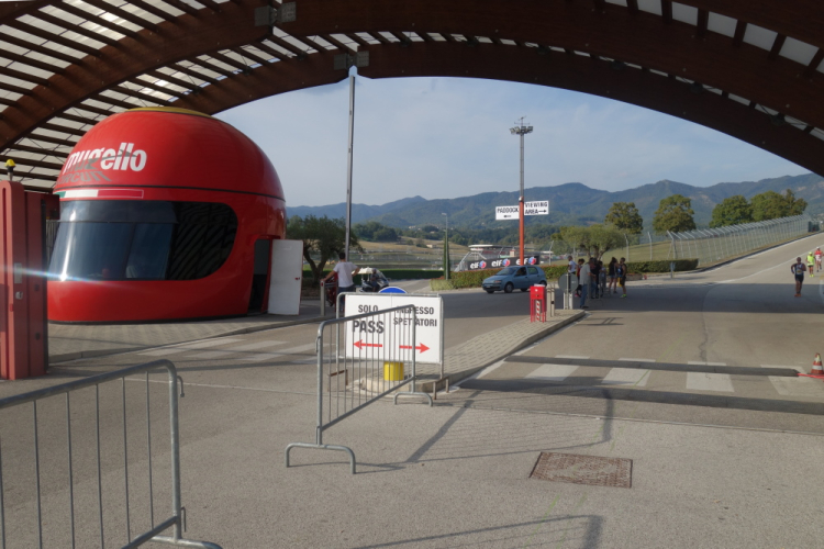 Hinein geht es das Mekka des italienischen Motorsports. Es läuft gerade ein Qualifying zum morgigen 500 ccm Motorradrennen. Atemberaubend, wie die Maschinen über den Kurs rasen. Da sehe ich einen freien roten Renner und mache mich auf die Verfolgung. Da ich aber mit meinem roten Flitzer ziemlich chancenlos bin, bleibe ich lieber beim Laufen.