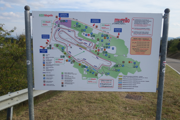 Vor den Toren Scarperias gibt ein roter Ferrari inmitten eines Kreisverkehrs einen Vorgeschmack auf das, was nach Scarperia auf uns wartet. Kurz nach dem Verlassen von Scarperia ist es dann soweit. Wir kommen zum Autodromo del Mugello.