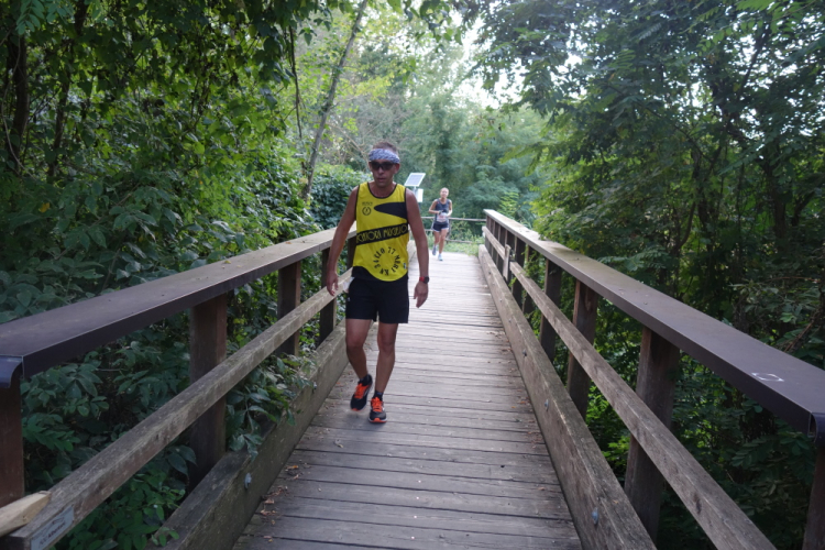 Km 30 wird passiert. Schön ist es hier zu laufen, aber es fällt mir schwer und ich mache Gehpausen. Erneut queren wir die Sieve. Auf einmal kommen mir Läufer entgegen. Wir sind an einer Wendepunktstrecke angekommen und laufen auf dieser bis hinter Km 36.