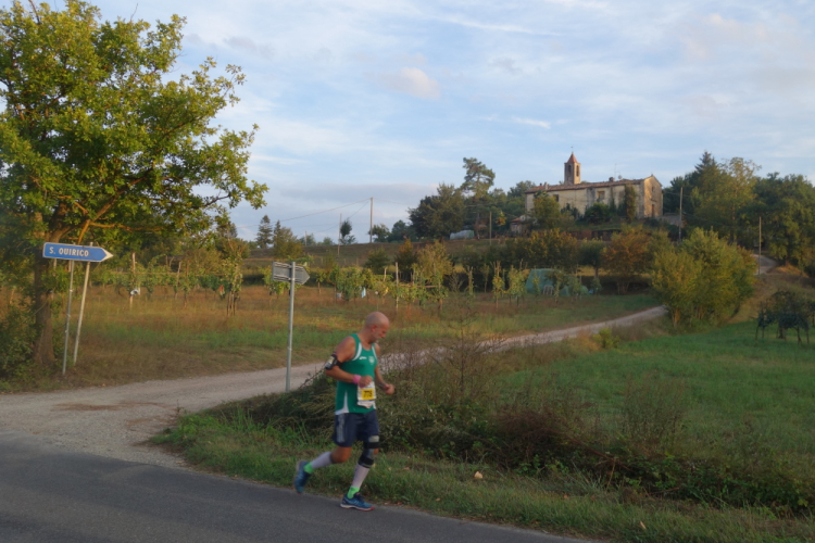 Es geht nach San Piero a Sieve. Ein Ambulanzwagen steht am linken Rand der Strecke und die Sanitäter haben offensichtlich hier bei Km 8 schon zu tun. In San Piero haben wir 32 Grad Hitze. Gut, dass wir an einem Wasserhahn vorbei laufen. Rasch den Kopf drunter halten und kühlen und schon ist das Laufen – für kurze Zeit – wieder erträglich. Bis die Sonne alles wieder ausgetrocknet hat.