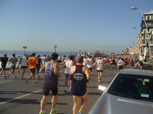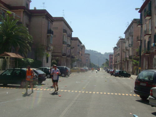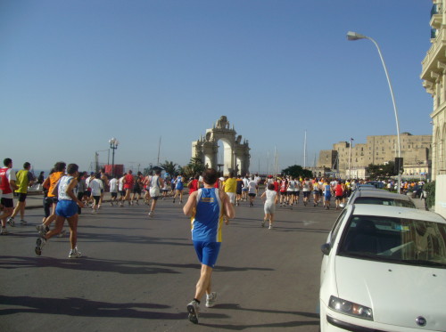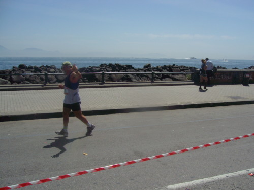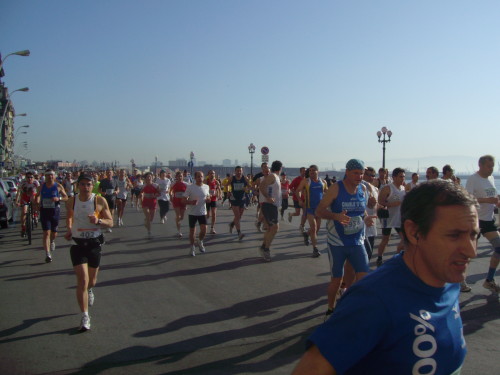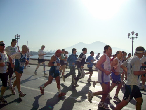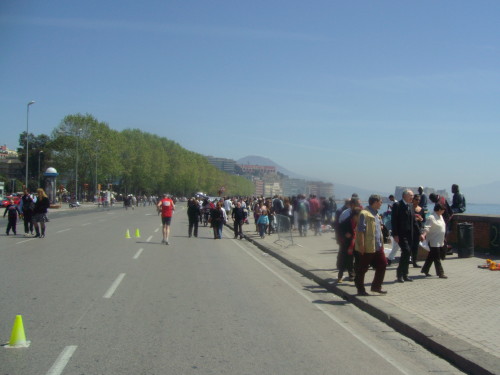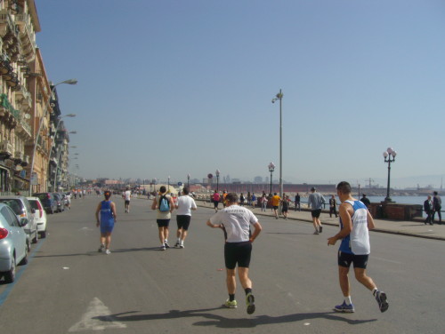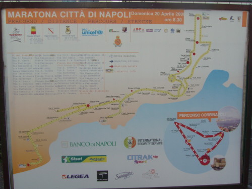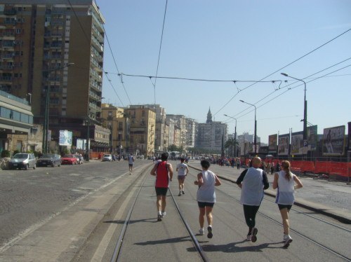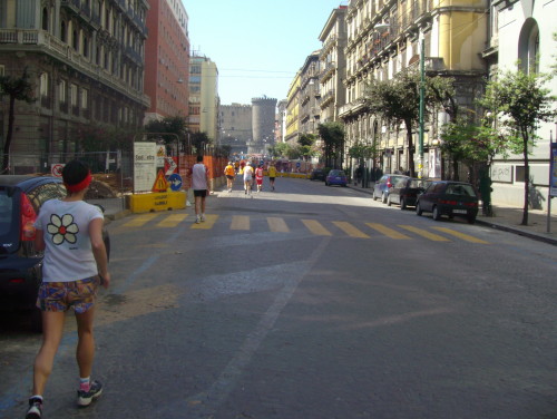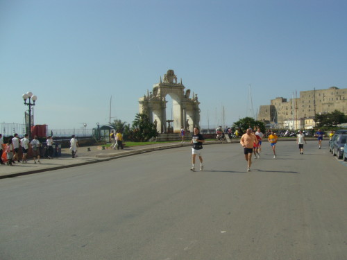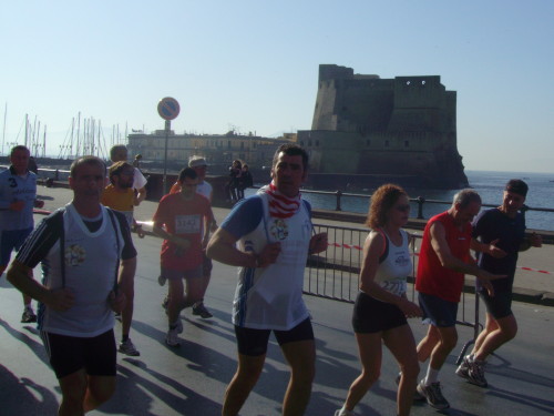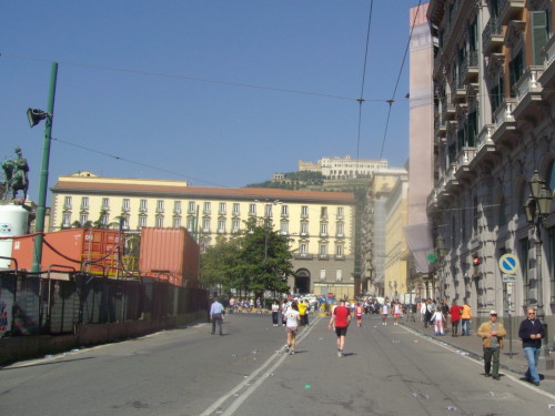 Ganz unspektakulär und pünktlich ist der Start. Die ersten Kilometer gehen der Küstenstrasse entlang, bis bei km 5 ein erster Wendepunkt kommt. Die Angaben 10-14 km sollen mir sagen, hier kommen wir gleich wieder durch. Kurz vor dem Startplatz biegen wir links in die Via S. Lucia und laufen noch mal zum Wendepunkt und auch wieder zurück. Klingt nicht so prickelnd, der Blick auf das Meer und das Castel dell' Ovo ist aber einmalig schön. Die Hafenburg aus 9. Jahrhundert liegt auf einem dem Stadtteil Santa Lucia vor gelagerten Felsen.