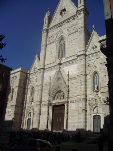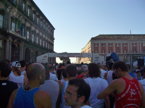 Vorher hole ich meine Startnummer in einem Zelt auf der Piazza del Plebiscito direkt vor dem Palazzo Reale, wo auch eine kleine Messe ist, ab. Der Palast der Vizekönige aus dem frühen 17. Jahrhundert ist heute Nationalbibliothek und Museum. Die Nationalbibliothek verfügt über einen Buchbestand von zwei Millionen Bänden. Als Anbau des Palazzo Reale entstand im 18. Jahrhundert das Teatro San Carlo, das älter ist als die Mailänder Scala, seinerzeit das größte Opernhaus der Welt und zahlreiche Uraufführungen (Rossini, Donizetti u.a.) erlebte.