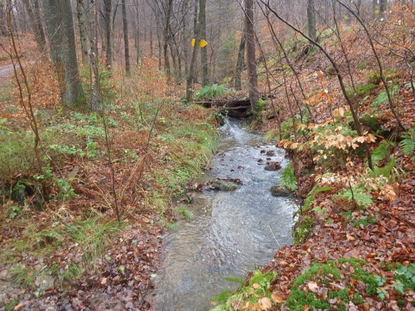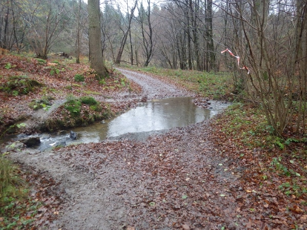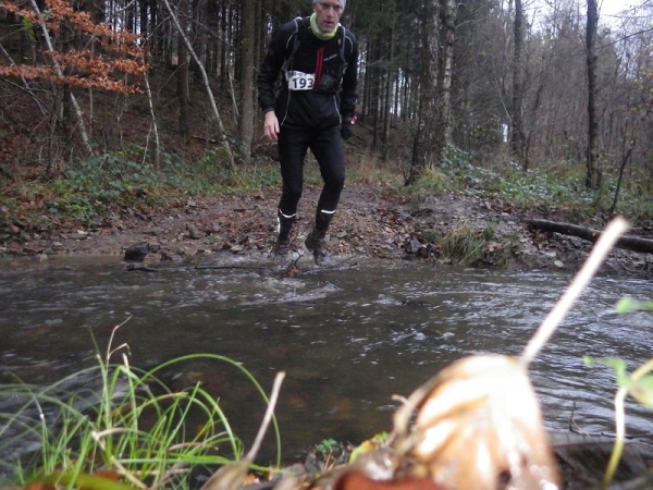 Genug gemeckert, jetzt kommen wir zu den schönen Dingen. Laufen in ursprünglicher Natur ist angesagt. Darauf wird hier viel Wert gelegt. Die Natur (sprich: der Morast) klebt schwer an den Schuhen. Kein Problem, denn der Veranstalter hat in weiser Voraussicht einige Bachläufe zum Durchqueren vorgesehen. Bei solchen Gelegenheiten kann man mal checken, ob man noch die Schuhe an den Füßen hat.