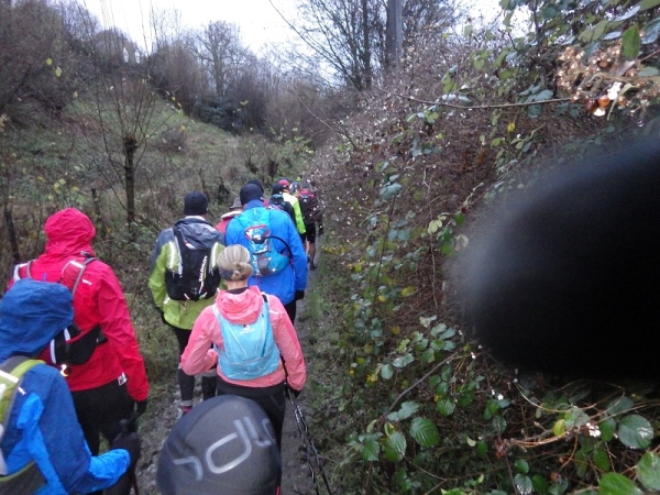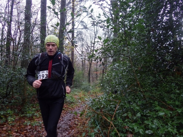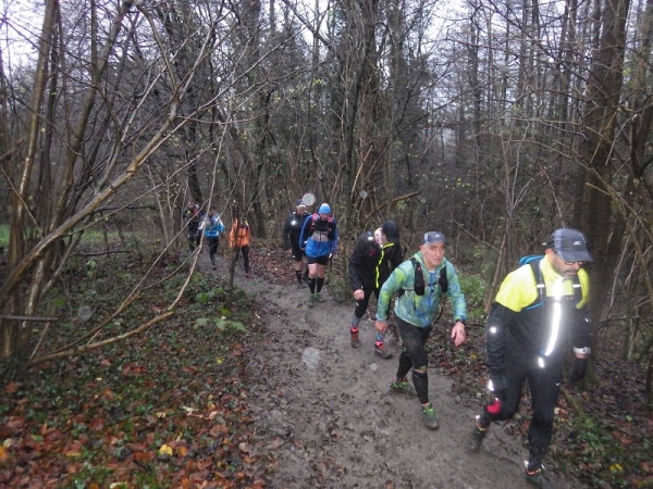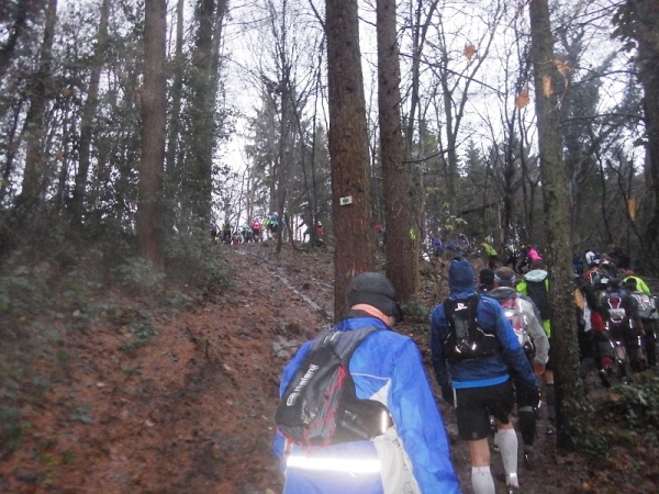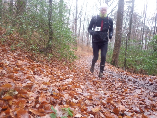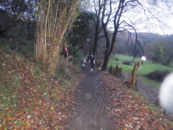 Dann sind wir auch schon wieder im Wald. Es ist erst 16.30 Uhr, aber es regnet immer noch und es ist sofort dunkel. Also Stirnlampe an. Ohne geht nichts mehr. Ein Kamerad aus Frankreich freut sich wie ein Junge, als ich ihn treffe. Er lässt mich nicht mehr aus den Augen. Später schließt sich ein Landsmann von ihm an, dessen Licht erloschen ist. In gelebter Deutsch/Französischen Freundschaft kommen wir ins Ziel.