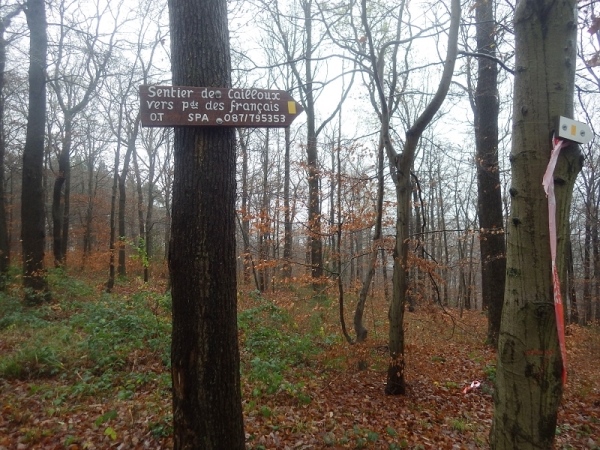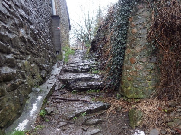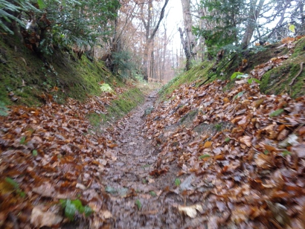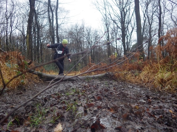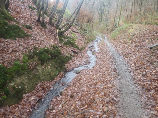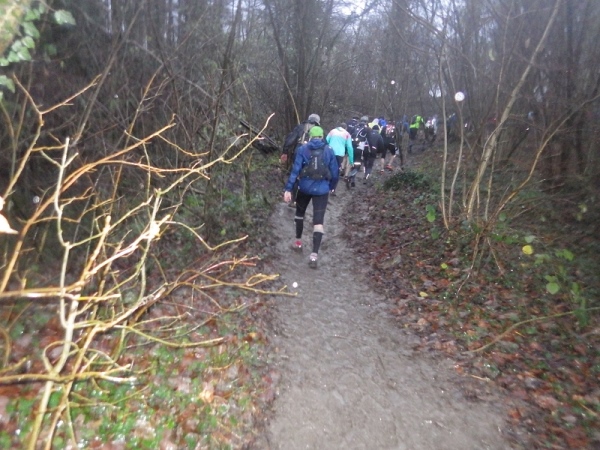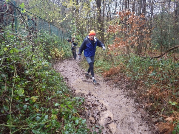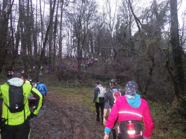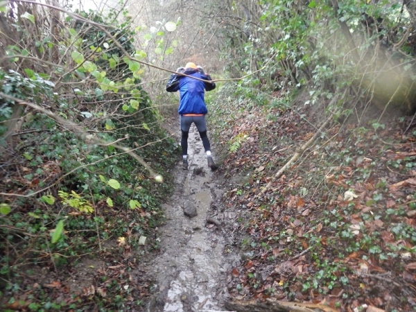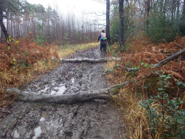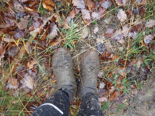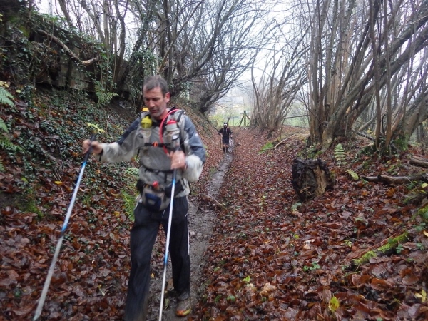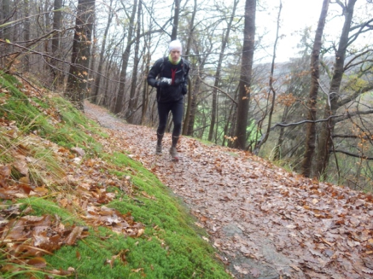 Schon bald vermisse ich meine Trailstöcke. Der tagelange Regen hat die Strecke in eine schmierige, extrem glatte Piste verwandelt und schon beim ersten Anstieg geht es zwei Schritte vor und einen zurück. Manchmal müssen Bäume und/oder Äste als Aufstiegshilfe herhalten. Ich bin wie üblich am Ende des Feldes und habe daher die schlechtesten Bedingungen. Allerdings brauche ich keine Markierungen, ich muss nur den Spuren im Matsch folgen. Das Wort des Tages lautet: „Merde“. Eigentlich heißt das „Scheiße“, aber es ist treffend.