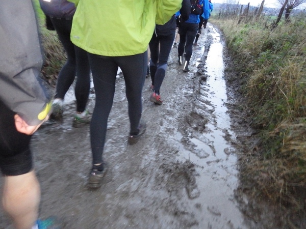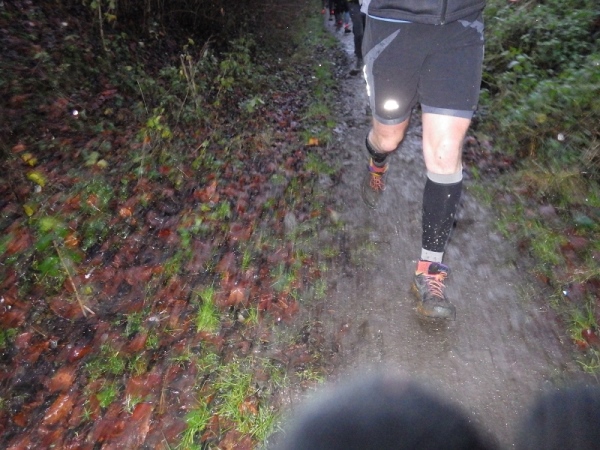 Im Ernst, die Strecke ist mit weißer Kreide und rot/weißen Flatterband ausreichend gekennzeichnet. Leider sind die Bänder nicht reflektierend, was es im Dunkeln etwas schwieriger macht. Und von der weißen Kreide ist vielerorts auch nichts mehr zu sehen. Der Matsch hat sie verschluckt. Aber als Trailrunner ist man auch Spurenleser …