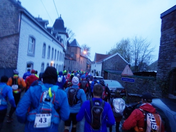 All das soll und darf uns nicht aufhalten. So dachten wohl alle vorangemeldeten Teilnehmer. Also trafen sich mehr als 400 hartgesottene Ultra Trailrunner in strömendem Dauerregen im ostbelgischen Örtchen Olne. Der Ort mit 3.800 Einwohnern ist dann doch so klein, dass der Veranstalter auch auf die Ausschilderung zur Anmeldung verzichtet hatte. Auch waren die Infos auf der Webseite (courirpourleplaisir.be) recht spärlich; übrigens bedeutet dies „Laufe mit Spaß“.