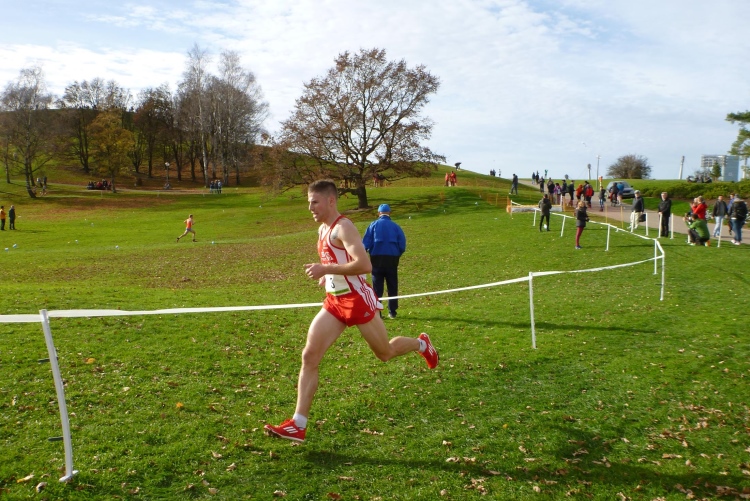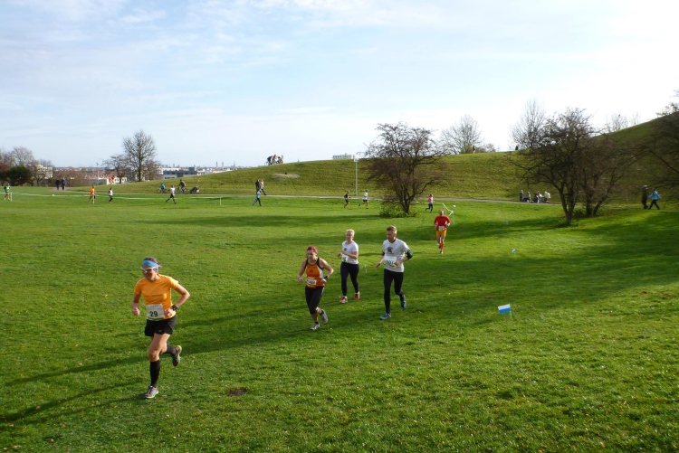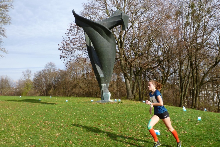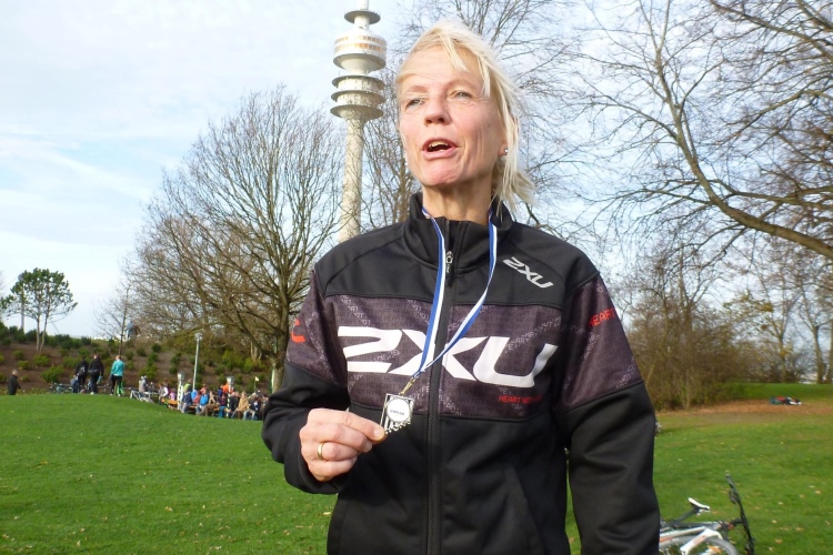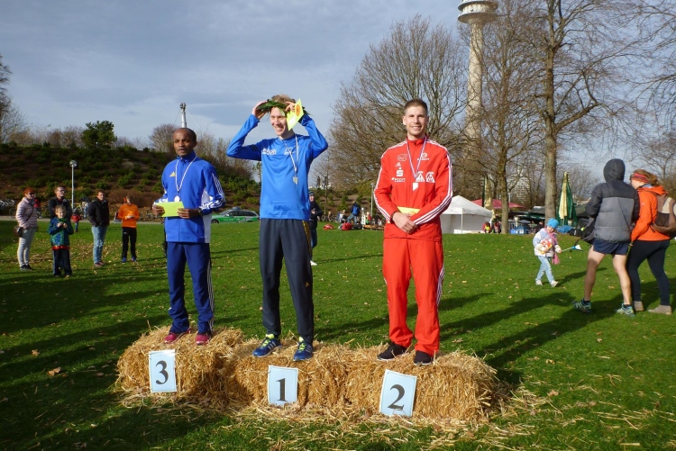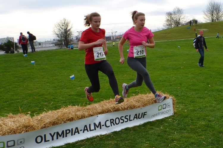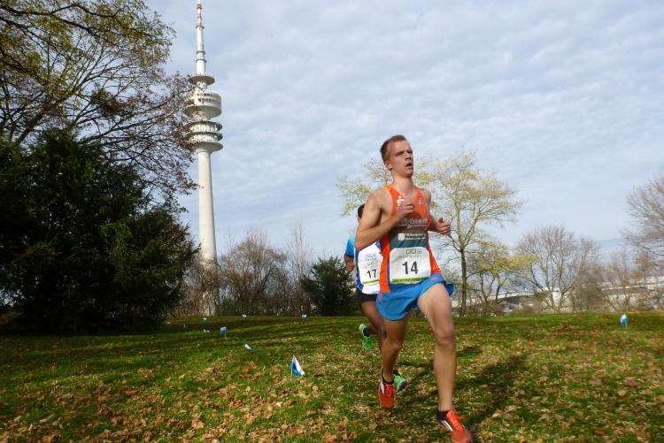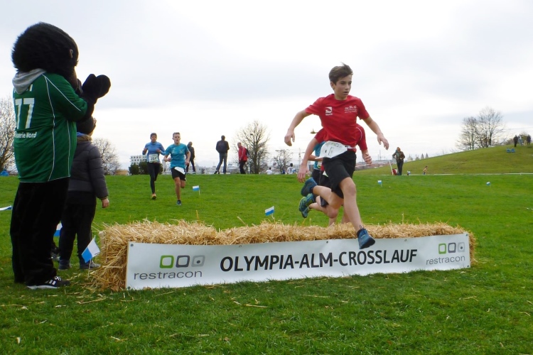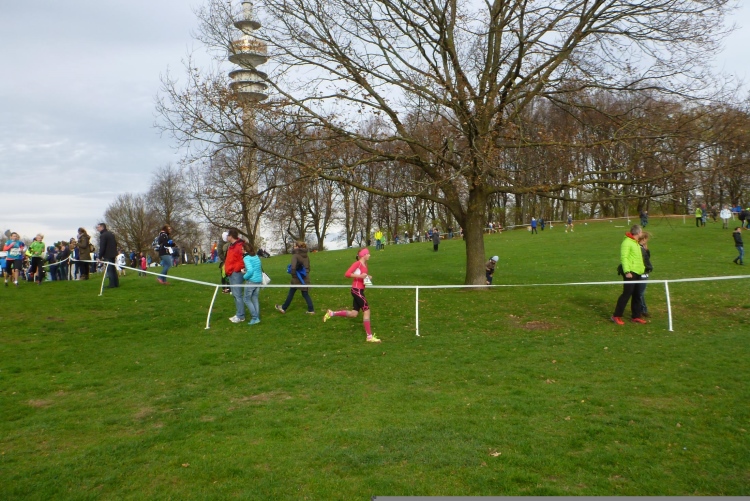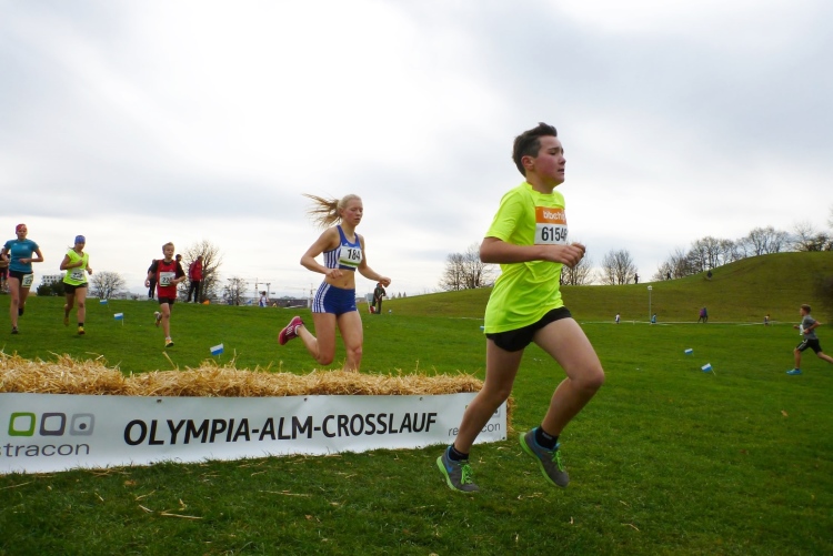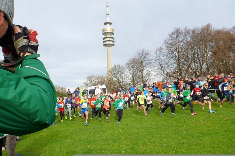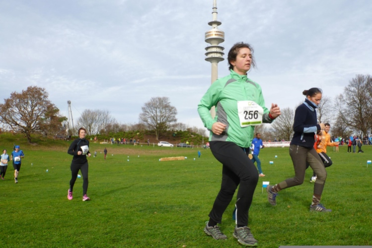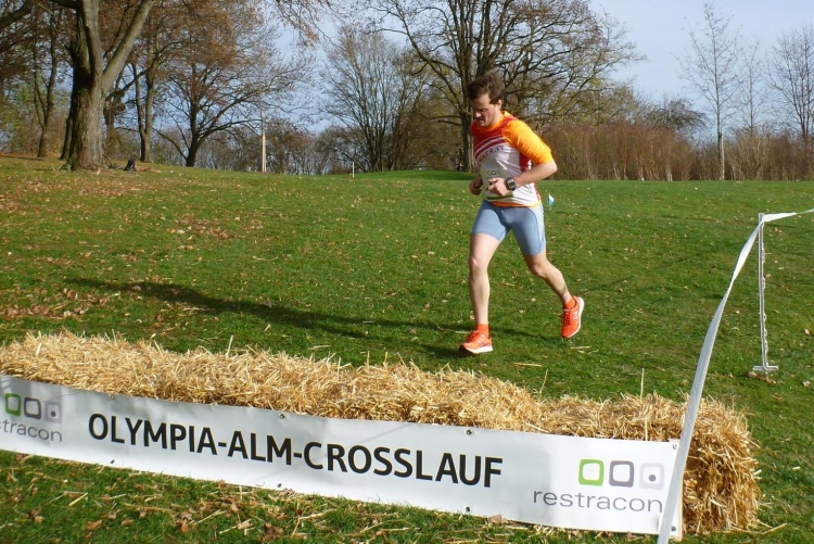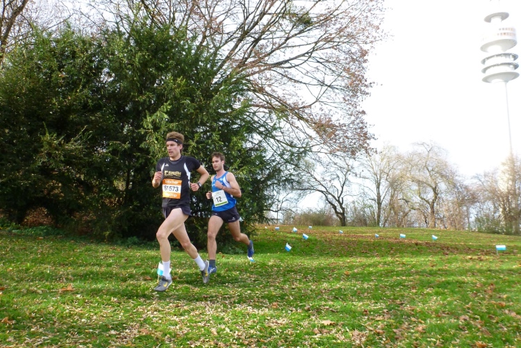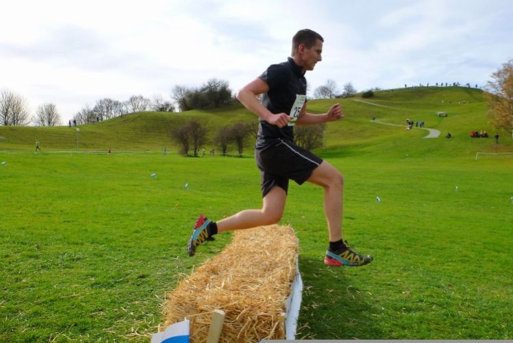 Und dann muss ich im letzten Lauf des Tages ran. Eine Woche vorher konnte ich in Ingolstadt meine Crosssaison beginnen, doch ob schon die schweren Beine vom Indoor Marathon Geschichte sind, wird sich gleich zeigen. Start, ich komme gut weg und bin schon erstaunt, dass ich mich im vorderen Feld behaupten kann. Nach ein paar Schritten wendet sich der Kurs nach links. Erste kleine Steigung hoch zu einem Wäldchen, wo der erste Strohbüschel übersprungen wird. Bei den 100, 150 flachen Metern könnten wir nach links unseren Blick zum Olympiasee und zum Olympiastadion schweifen lassen, doch jetzt wäre das fatal. Der Boden verlangt Konzentration, denn immer wieder sind unebene Stellen und Löcher zu sehen, auch einige Wurzeln könnten dir den Fuß legen.