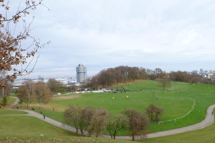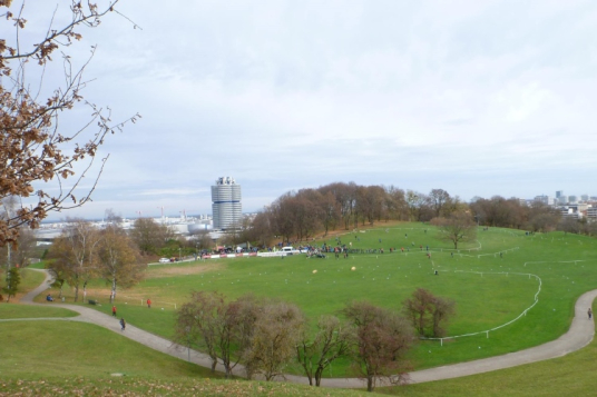 Parkplätze findet man entlang der Ackermannstraße. Bis 2014 hat man da die Langstreckler beim München Marathon losgeschickt. Dann marschierst du einfach den Olympiaberg hoch in Richtung Aussichtspunkt und siehst dann das Laufgelände in einer Senke liegen.