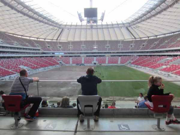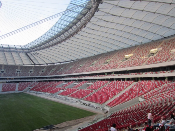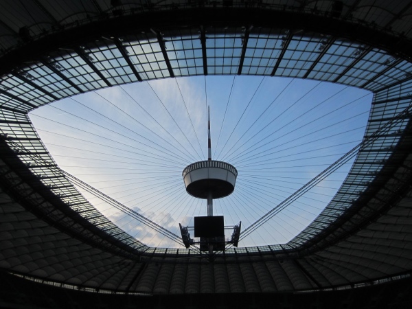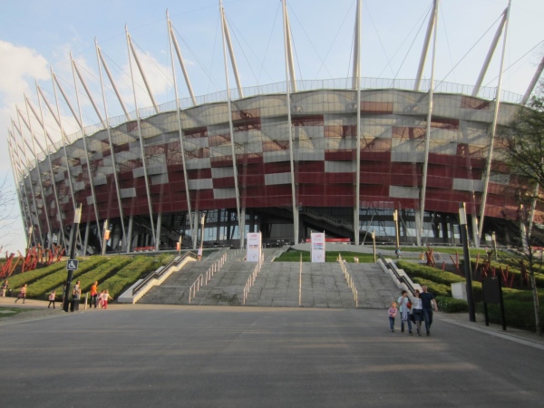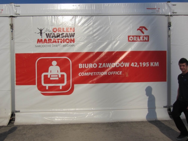 Ich bin wie die Italiener und auch das Pärchen aus Hongkong, das neben mir eincheckt, nur wegen des Marathons hier. Daher verweile ich nicht in meinem Zimmer im 8.Stock, sondern trachte so schnell wie möglich zur Expo zu kommen. Alle Straßenbahnen gegenüber dem Hauptbahnhof fahren die mehrere Kilometer lange aleje Jerozolimskie nach Ostenüber die Weichselbrücke most Poniatowskiego zum Rondo Jerzego Waszyngtona. Wer sich nicht auskennt, schaut einfach auf die anwesenden Fahrgäste – fast nur Läufer – die alle zur Expo wollen. Das Biuro Zawodów befindet sich in einer „Zeltstadt“ gegenüber dem polnischen Nationalstadion, dem Stadion Narodowy, das im Januar 2012 für die Fußball-EM 2012 eröffnet wurde und eine Kapazität von 58.000 Zuschauern hat.