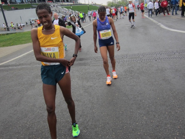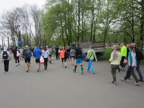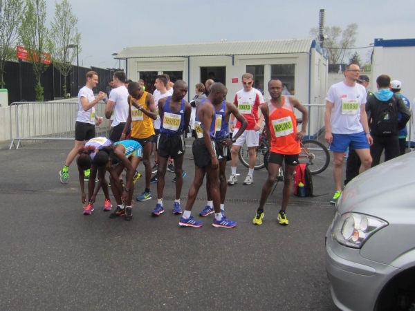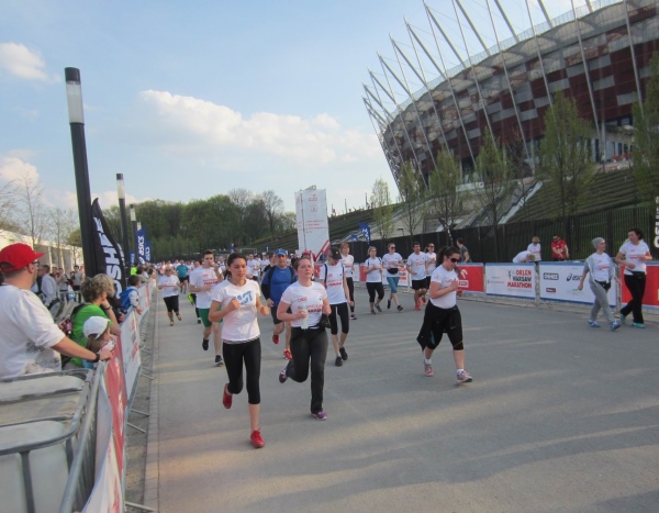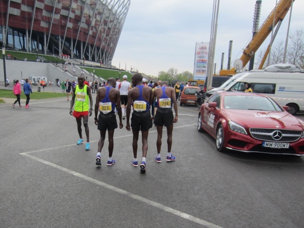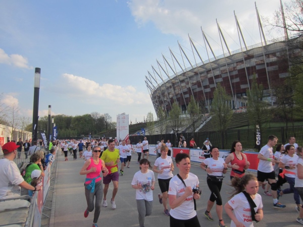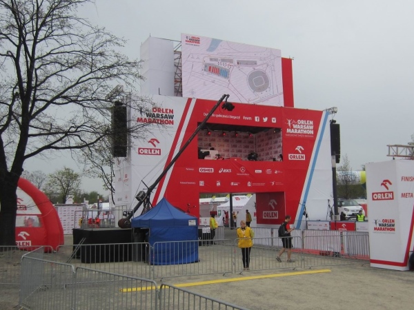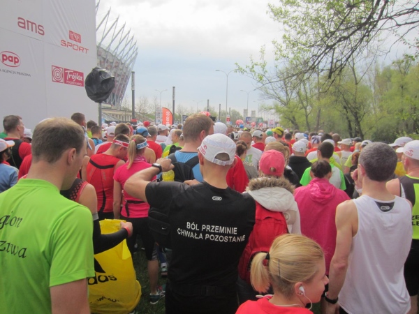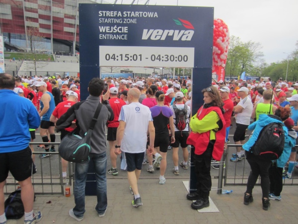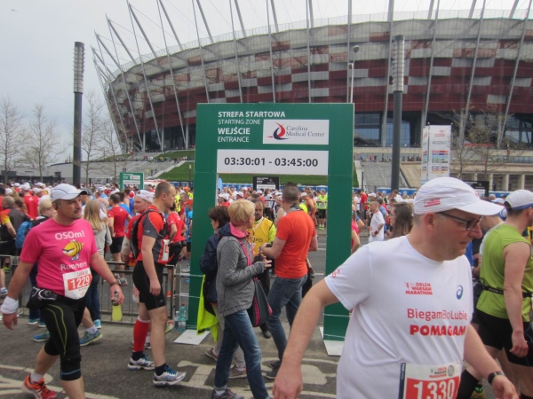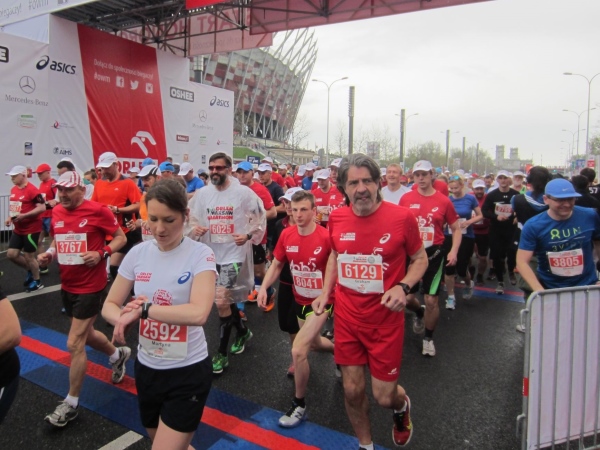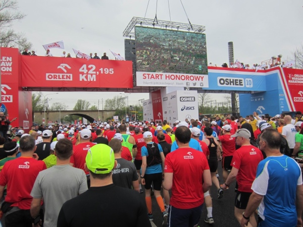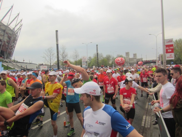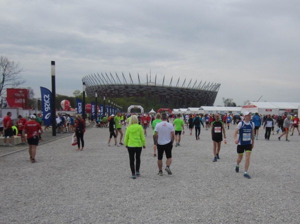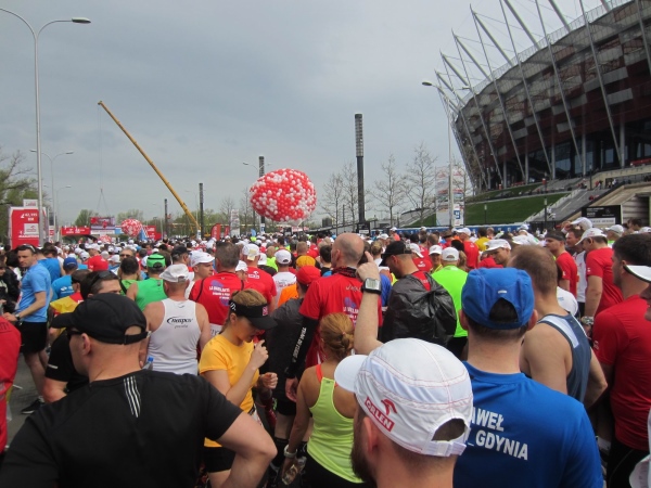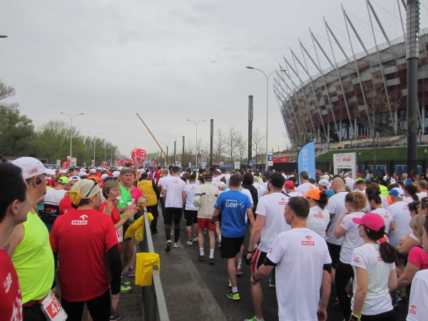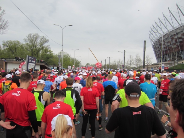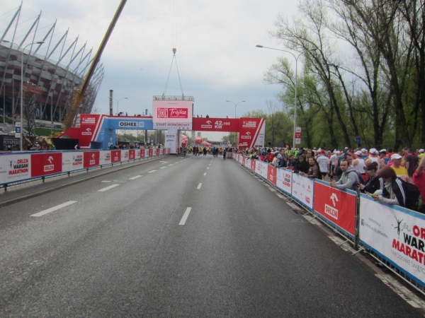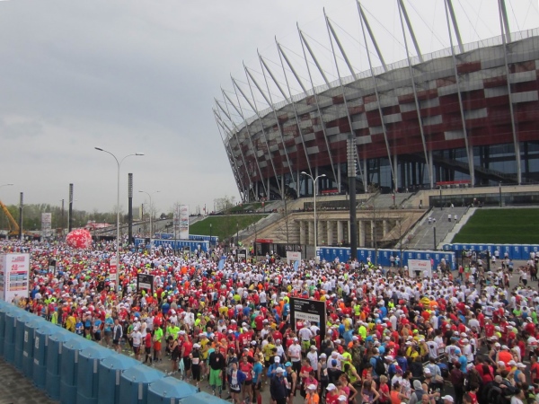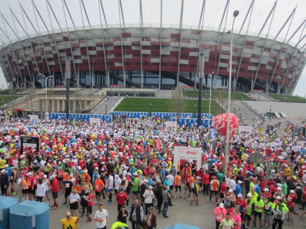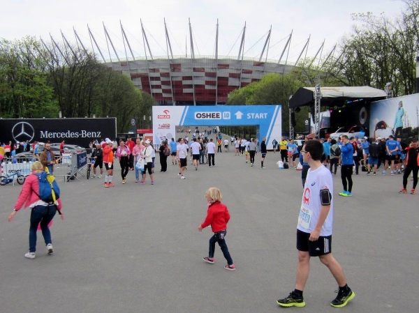Der Startareal an der Westseite des Nationalstadions ist in zwei Sektoren geteilt, der dem Weichselufer zugewandt e Teil ist für ca. 9500 Marathonläufer reserviert, auf der anderen Seite der Absperrung sind die 10 km-Starter postiert, auch an die Zehntausend, deren Laufstrecke in einem Rundkurs vorbei an der berühmten Altstadt von Warschau , der Stare miasto, verläuft, während der im Vergleich zu 2014 abgeänderte Marathonkurs in die entgegengesetzte Richtung führt.