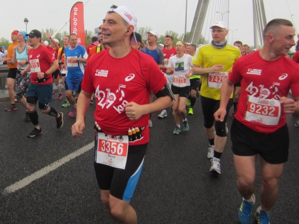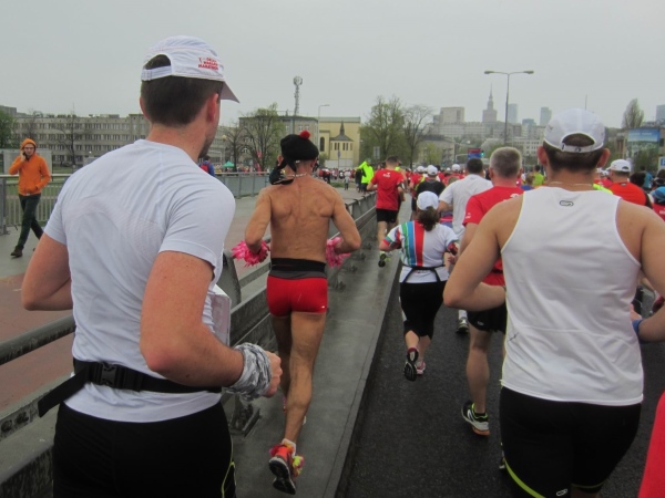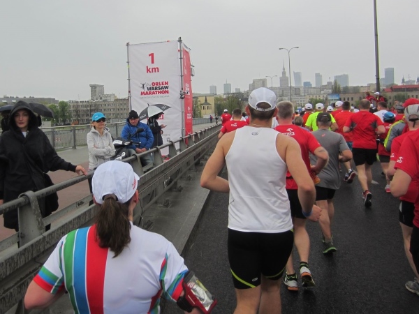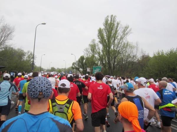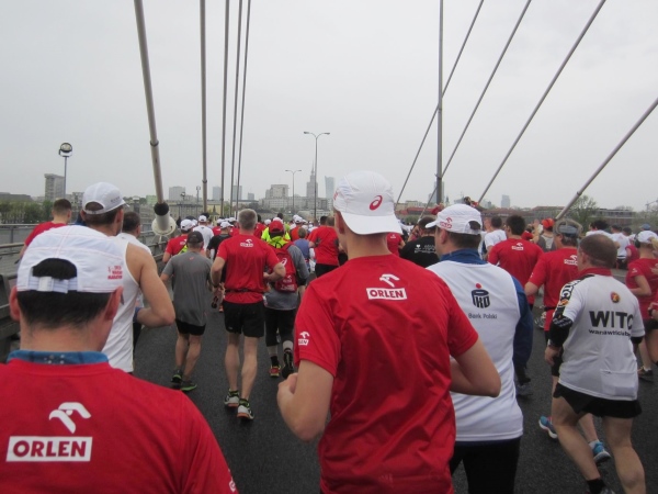 Die 10 km-Läufer bewegen sich zuerst, dann kommen wir dran. Bis zur Zeitnehmung vergehen für Läufer in meiner Startposition sechs Minuten. Der Marathonkurs führt ca. 500 m in Richtung Norden, leicht ansteigend geht es dann nach Westen auf die most Świętokrzyski über die Weichsel in Richtung Zentrum zur Metrostation. Die 10 km-Starter laufen über die Brücke entlang der Weichsel nach Norden und zurück, diese Strecke bietet einige bauliche Attraktionen.