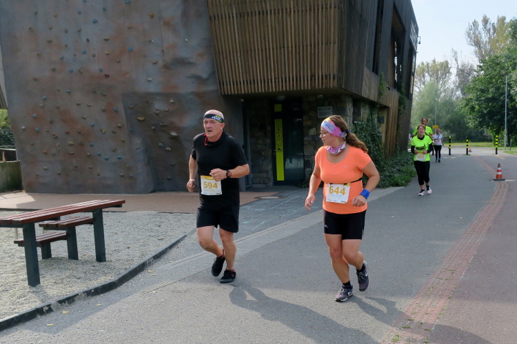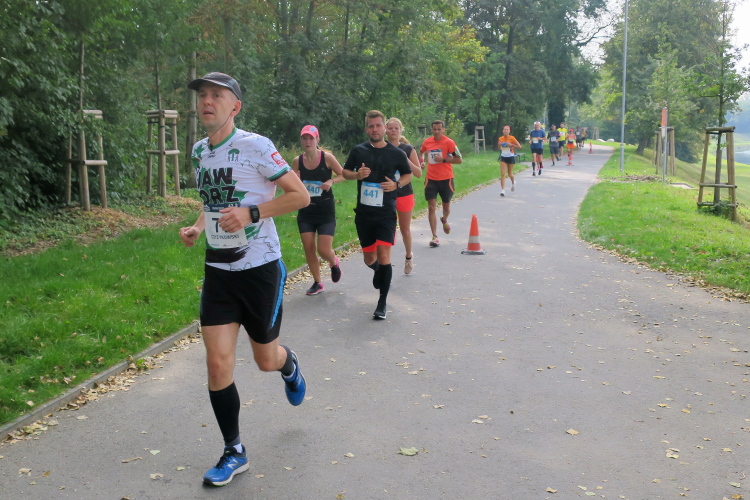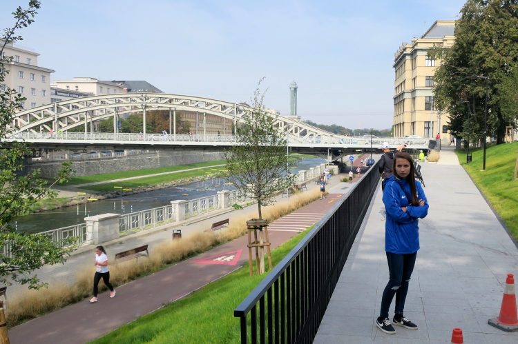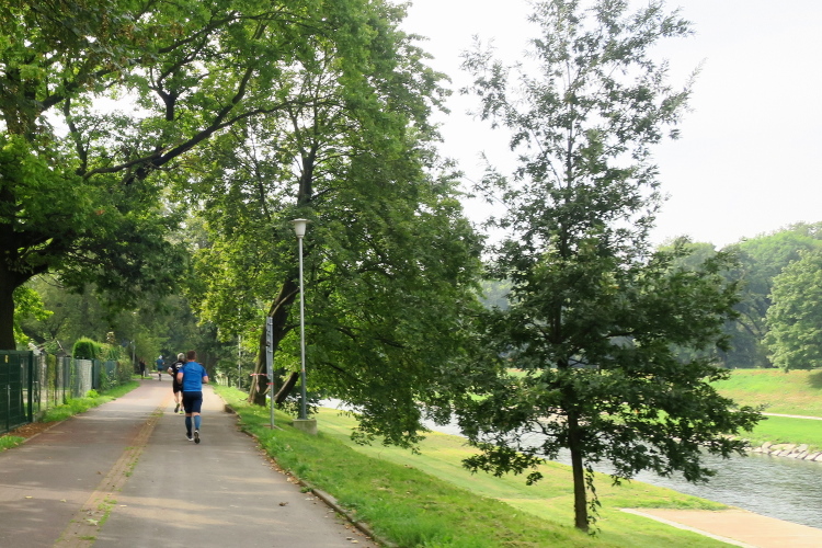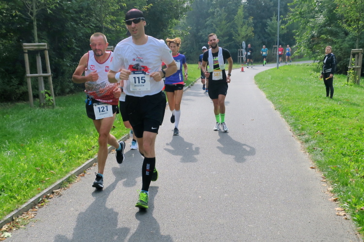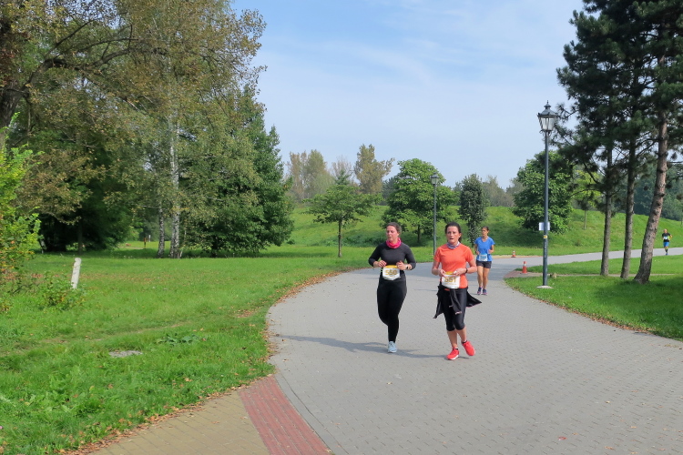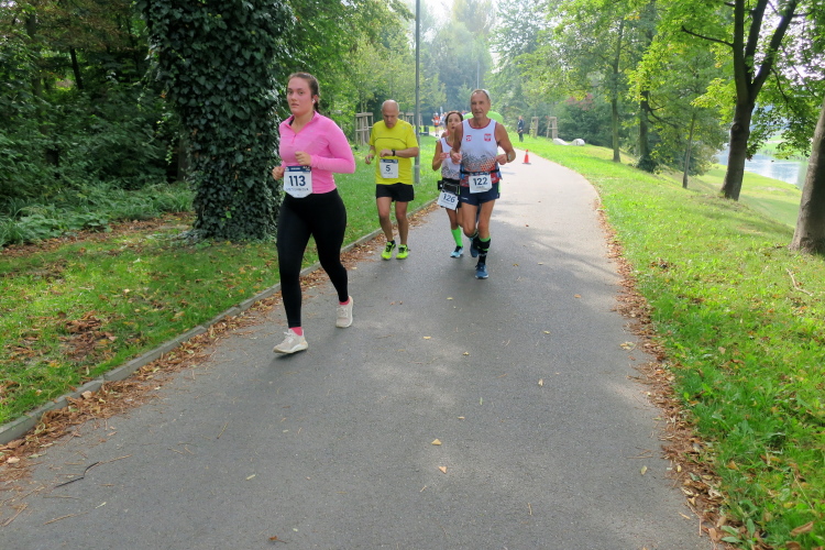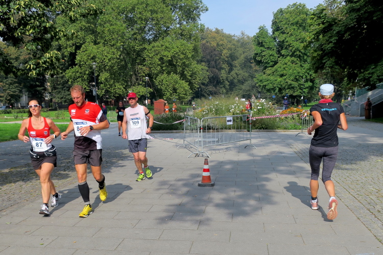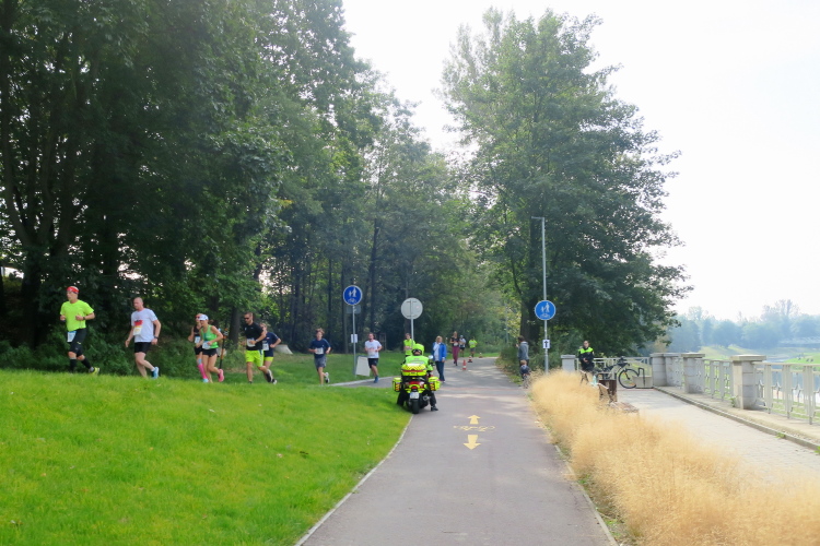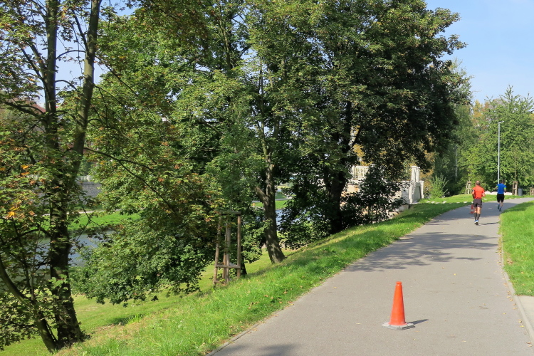 Ich bin Tempomacher für zwei bequeme Halbmarathonläufer. Weit habe ich es gebracht. Nach einem weiteren Kilometer folgt ein Abschnitt mit Gegenverkehr. Die ganz Schnellen bewegen sich bereits auf die Brücke zu, die zum Ziel auf dem Hauptplatz führt. Für mich geht es in einer Grünzone mit Spielplatz und Raststätte an der Ostravice weiter. Ich habe nun ausreichend Gelegenheit zu fotografieren. Es kommen mir Dutzende Läuferinnen und Läufer aus den drei Bewerben entgegen.