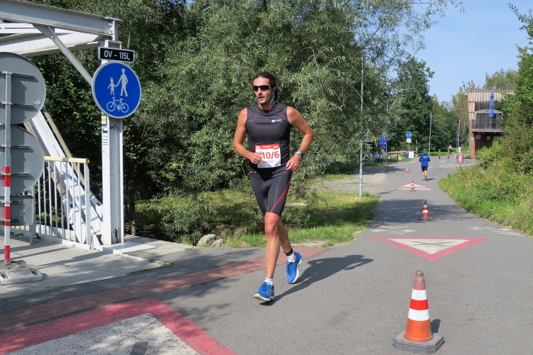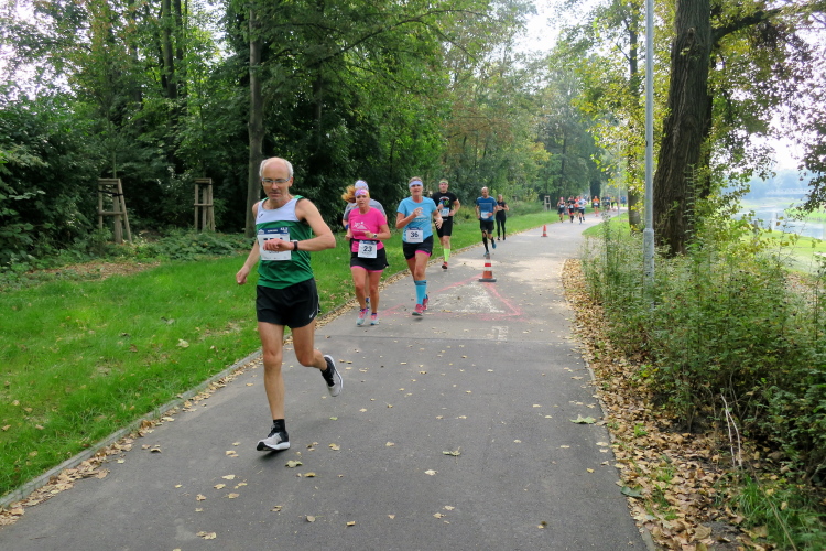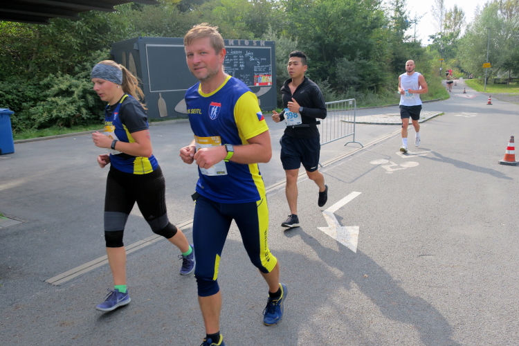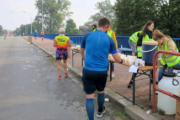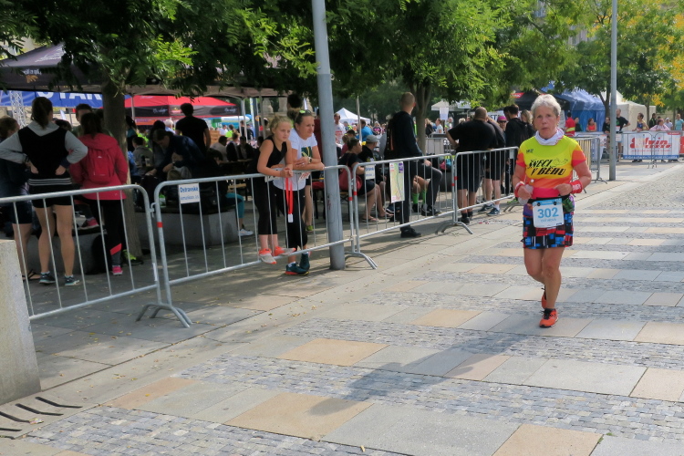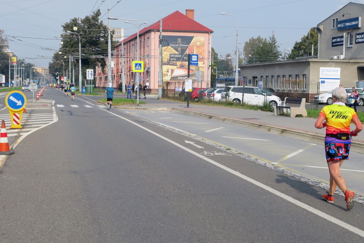 Meine Absicht ist, die Halbdistanz endlich wieder einmal unter 2:30 zu schaffen. Aber ich merke, dass mich die kleinen Steigungen hinauf zum Friedhof bremsen. Wieder kommen mir Miroslav und Tomáš entgegen. Ich passiere beim zweiten Durchlauf das Ziel nach 2:35:44. Diesmal bleibe ich bei der Labe im Ziel stehen und lösche meinen Durst.