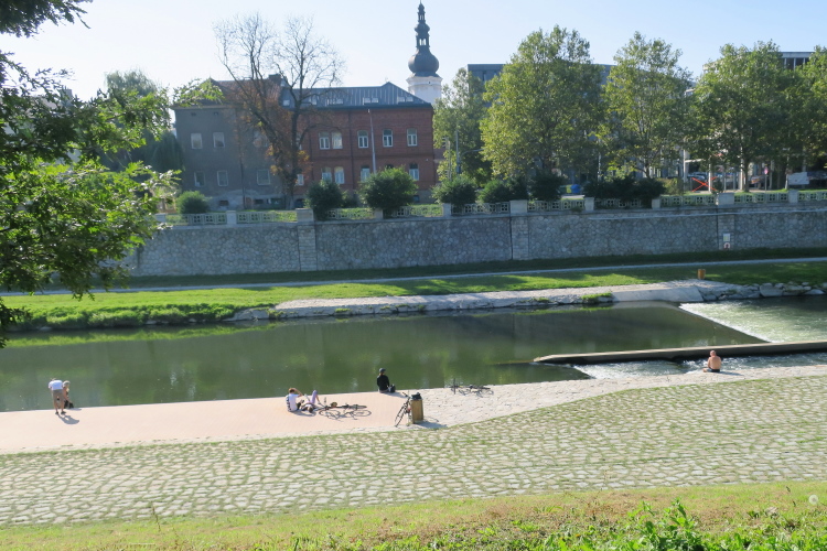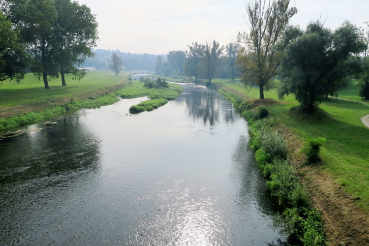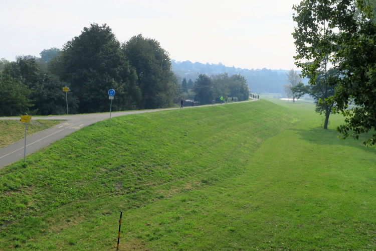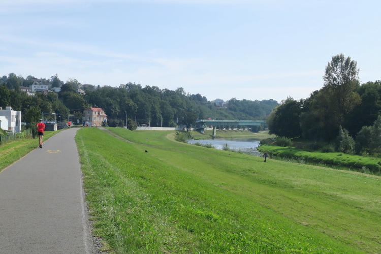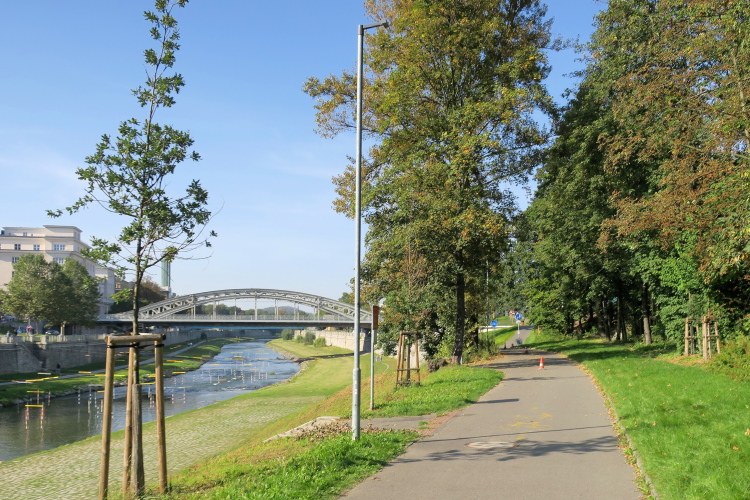 Wieder dreht der Kurs nach Osten, die 5 km-Anzeige Tafel ist knapp vor der Labe in Sicht. Dort gibt es Wasser, Iso, Bananenstücke und Weintrauben. Ich blicke auf den Fluss Ostravice hinab, er fließt in nördliche Richtung. Der nun entlang der Ostravice, die aus dem mährisch-schlesischen Beskiden stammt, nach Südosten verlaufende Rad- und Spazierweg hat infolgedessen einen leichten Anstieg, den man aber nicht bemerkt. Es wird ein warmer Spätsommertag, die Sonne stört aber jetzt auf dem bewaldeten, befestigten Uferareal nicht.