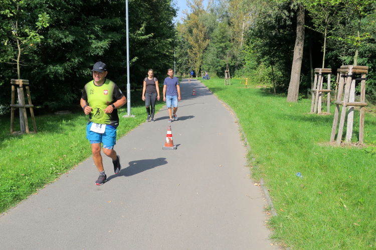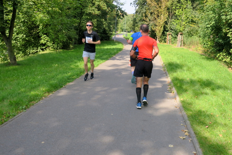 Der Kurs führt nun leicht ansteigend hinauf zum Zentralfriedhof von Ostrava. Bei der Wende steht eine Helferin und brüllt enthusiastisch „Parada, parada!“ „Großartig“, so die deutsche Übersetzung. Als ich zum Kinderspielplatz komme, stapft mir Tomáš entgegen. Er liegt gut 500 m hinter mir.