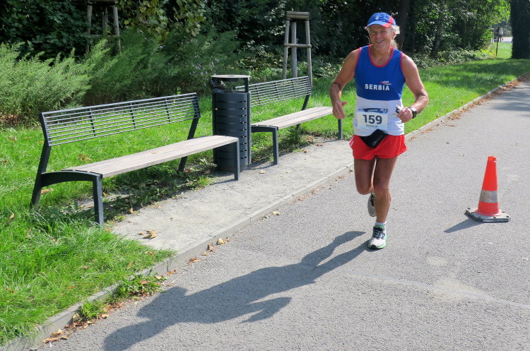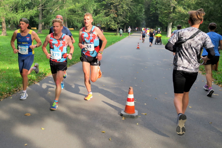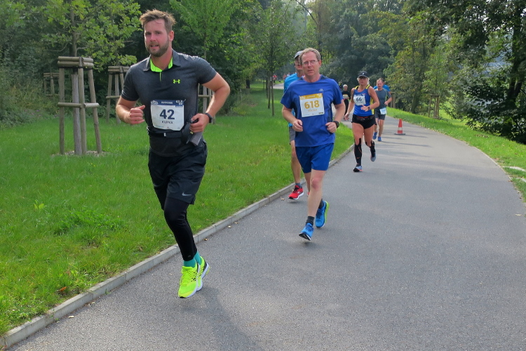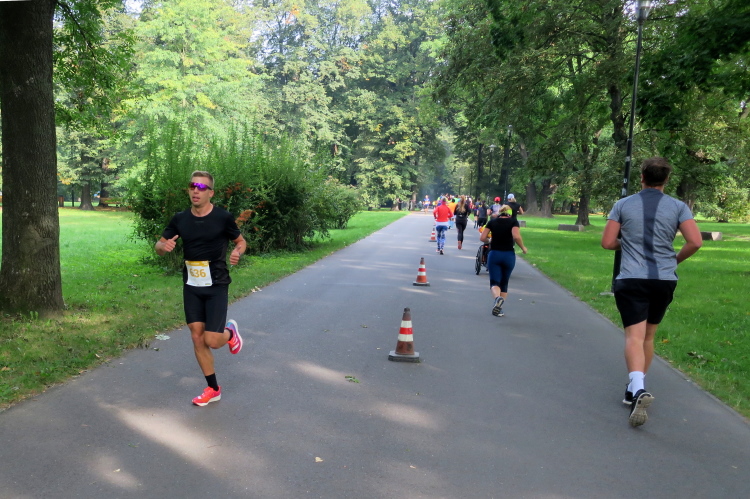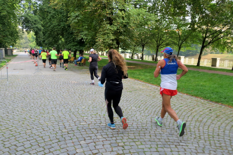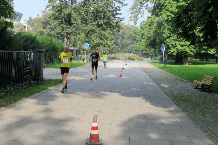 Es geht zügig einen halben Kilometer in nordöstlicher Richtung durch die Stadt, später dann nach Osten in Richtung Fluss. Es folgt ein ca. 3 km andauernder Rennverlauf mit Begegnungszonen im Komenského Park mit vielen Schatten spendenden Bäumen. Schon auf der Hälfte der Strecke hier im Park kommen uns die Schnellen entgegen, darunter auch Drago. Für mich ideal, einige Schnappschüsse zu machen.