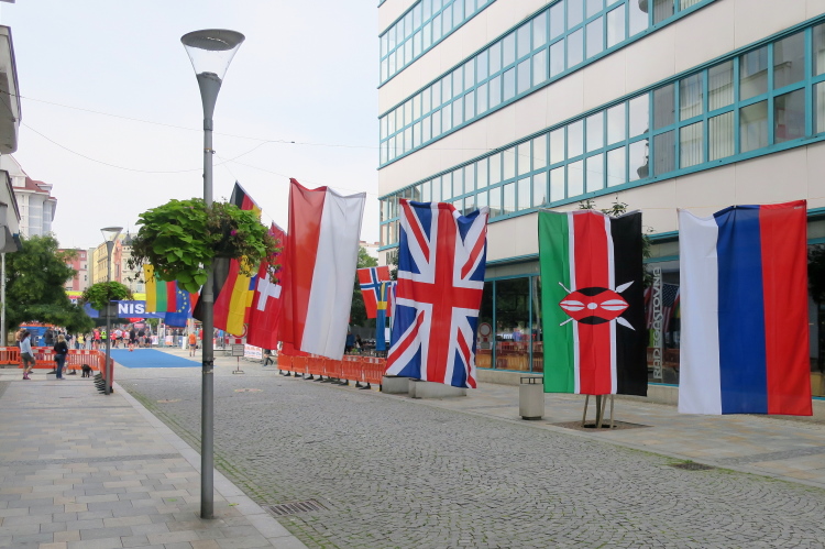 Sehr nett finde ich die Fahnenparade, an die 20 verschiedenen Flaggen der Teilnehmerländer hängen auf Seilen in der Zieleinlaufstraße. Ein Pärchen bittet mich um ein Foto, die beiden lachen glücklich, als sie sehen, dass ein Oldie wie ich den Auslöser auf dem iPhone richtig gedrückt hat.
