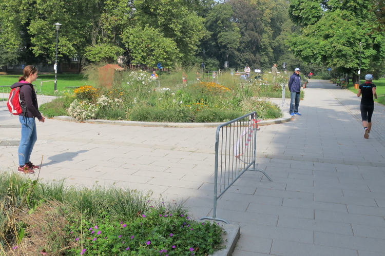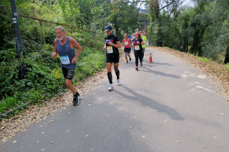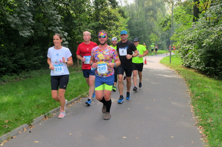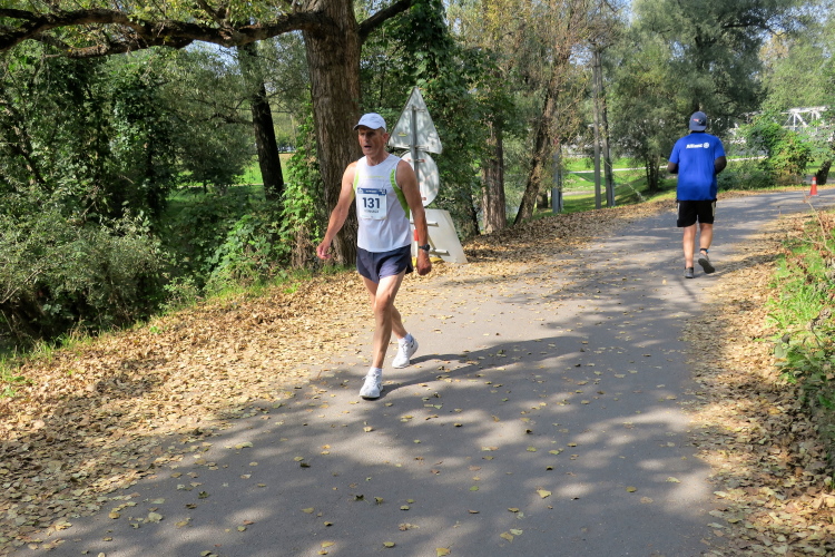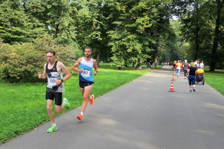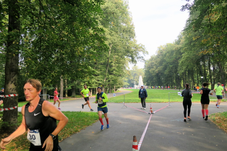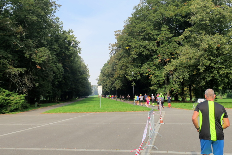 Es geht in die zweite Runde. Im Park kommen uns nun viele schnelle Staffelläufer entgegen, auf den roten Startnummern sieht man die Reihenfolge – viele sind bereits in der 2. Runde. Zwar hat sich das Feld gelichtet, aber man ist niemals alleine auf der Strecke. Die beiden Polizisten, die den Abbiegeverkehr regeln, haben nun leichtes Spiel.