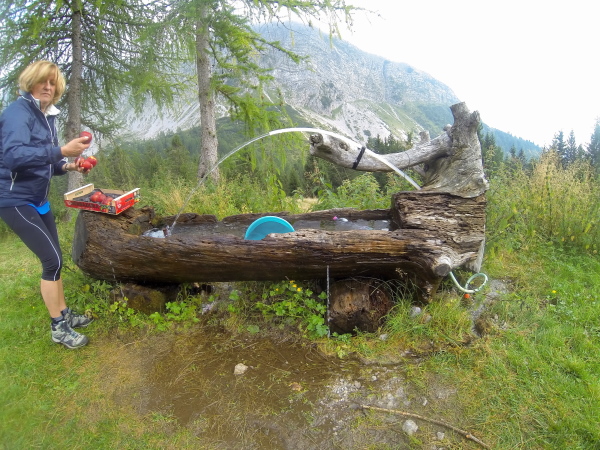 Kein Handyempfang, dafür ein Hüttentelefon mit Wählscheibe. Das Wählen im Kreise dauert ultralange. Welche Ironie, aber meine Frau geht Gott sei Dank ran und ich kann Entwarnung geben. Cappuccino bestellen, Wechselsachen anziehen. Ich habe noch eine trockene Unterhose dabei, Beinlinge wärmen, trockenes Shirt und Armlinge. Aus meinem Rucksack ist das Wasser unten nur so rausgelaufen. Alles ist durchweicht, nur der Inhalt der Zipplocktüten nicht!