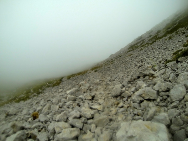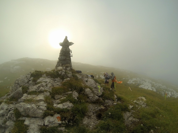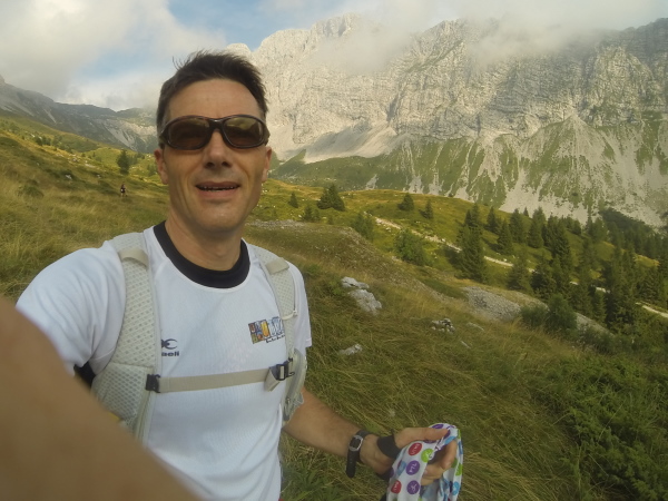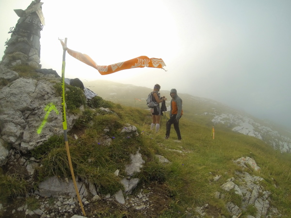 Auf ca. 2000mtr stehend eine Kaltfront mit heftigen Winden und ca. 5 Grad frontal abzubekommen, ist kein Vergnügen. 5km hinter uns ist ein Rennstopp ausgesprochen. Hilft mir gerade wenig. Mein Sturz vor einer Stunde kommt erschwerend hinzu. Knie verdreht, Stock gebrochen, Rippenprellung. Schlechte Phase erwischt. Regenhose und Regenjacke, Buffs schützen gerade so. Laufen, laufen, laufen, nur damit ich nicht auskühle. Schwierig bei den Schmerzen. Ich muss noch auf 2500mtr hoch, um aus diesem Hochgebirge ins Tal absteigen zu können. Das kalte Wasser läuft an meiner Regenhose in meine Schuhe. Eisklumpen. Die Kontrollstelle auf dem 2500 mtr hohen Pass hat ein kleines Zelt. Ich verkrieche mich darin, um meine eiskalten Socken gegen meine wasserdichten Sealskin-Socken zu tauschen. Welche Wohltat.