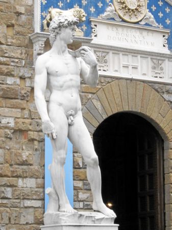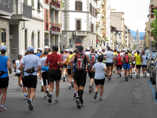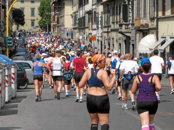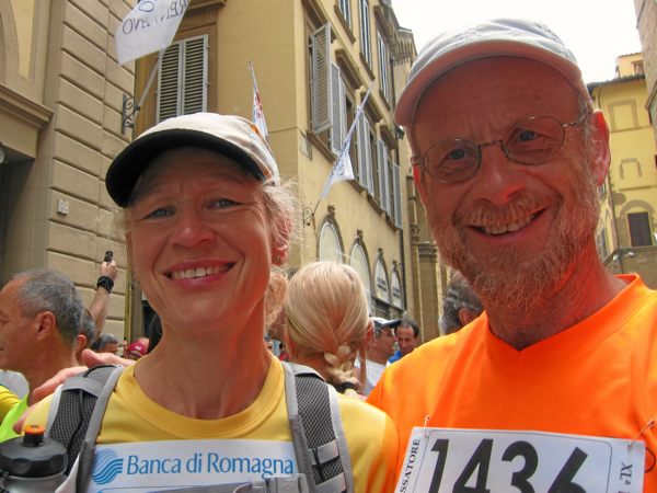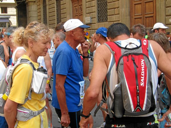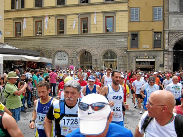 Samstag um 15 Uhr war Start mitten in Florenz. Dort, rund um die Piazza della Signora, dort wo der weltberühmte David von Michelangelo steht (eine Kopie, das Original steht in der Galleria dell' Accademia ein paar Straßen weiter), hatten sich schon Stunden zuvor Massen von Läuferinnen und Läufern samt Angehöriger breit gemacht. Man zog sich um, nahm noch ein letztes Vesper zu sich, lag auf dem Boden für ein letztes Nickerchen, tauschte Erfahrungen aus, spazierte durch die Gassen und Plätze, bekämpfte seine Nervosität - kurz man verstärkte das gewohnte Durcheinander, auf das man in Florenz auf Schritt und Tritt trifft, machte es ein wenig bunter und trotzdem hatte ich den Eindruck, dass uns eigentlich niemand registrierte.