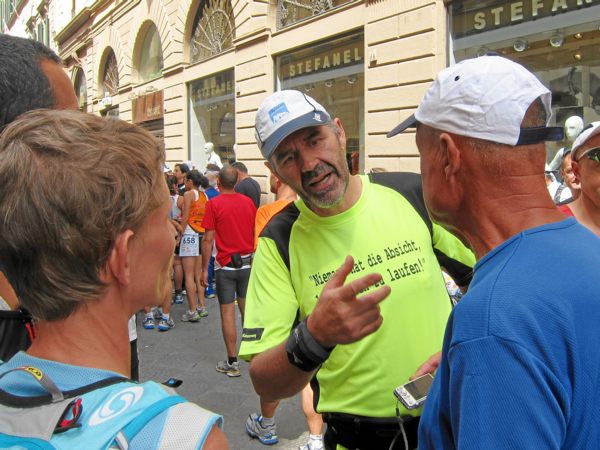 Ein paar der ganz wenigen deutschen Teilnehmer hatte ich getroffen, als ich in einer Schlange vor den sieben Dixis wartete. Mit dabei Hans Drexler, vielen bekannt unter seinem Pseudonym "Schneggi". Er war bereits mehrmals bei diesem Lauf und versorgte mich sofort mit Tipps. Auch Gerhard Penzel war da, ein Veteran, was den Passatore betrifft und auch er wusste, was alles zu beachten war. Die vielen Autos, die man auf der Strecke antreffen würde, seien nicht der normale Verkehr, sondern Begleitfahrzeuge von Läufern. Nun, ich würde ja sehen.