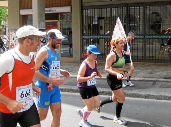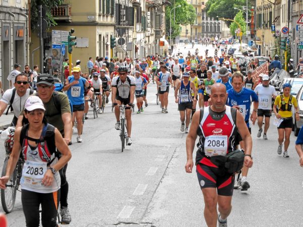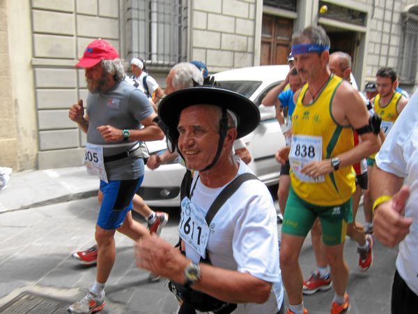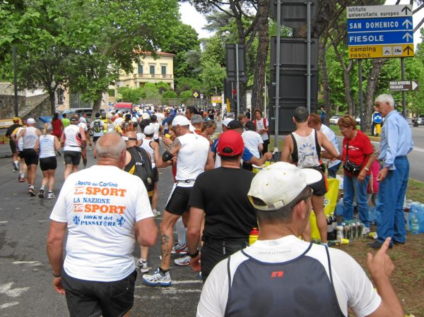 Die ersten vier Kilometer in der Stadt verliefen ziemlich eben und kurzweilig, bis es dann langsam aufwärts ging Richtung Fiesole. Mit einem Mix aus Joggen und Gehen bewegten wir uns aufwärts. Ganz weit hinten in der Ferne sah ich die Fahrradbegleiter, die dem Feld folgten. Angelika hatten wir eingeholt und trafen auf Birthe, die wir vom Transalpin 2010 her kannten. Sie wollte heute gut durchkommen, musste sie doch vergangenes Jahr den Lauf wegen zu großer Hitze zu Beginn und Kälte auf dem Pass abbrechen. Heute lief sie flott, aber respektvoll und kam dann auch weit vor uns im Ziel an. Die Temperatur war dieses Jahr mit etwa 25 Grad auch richtig angenehm.