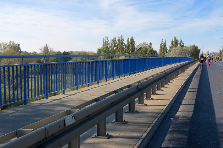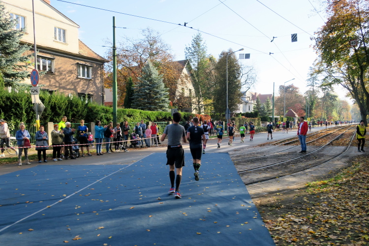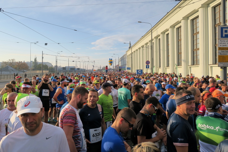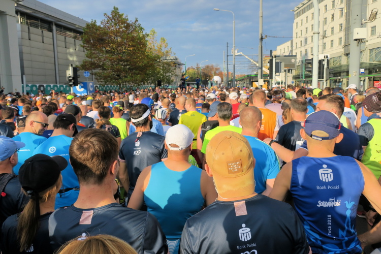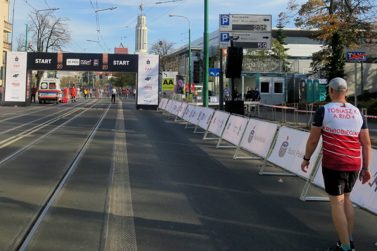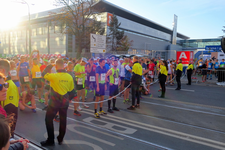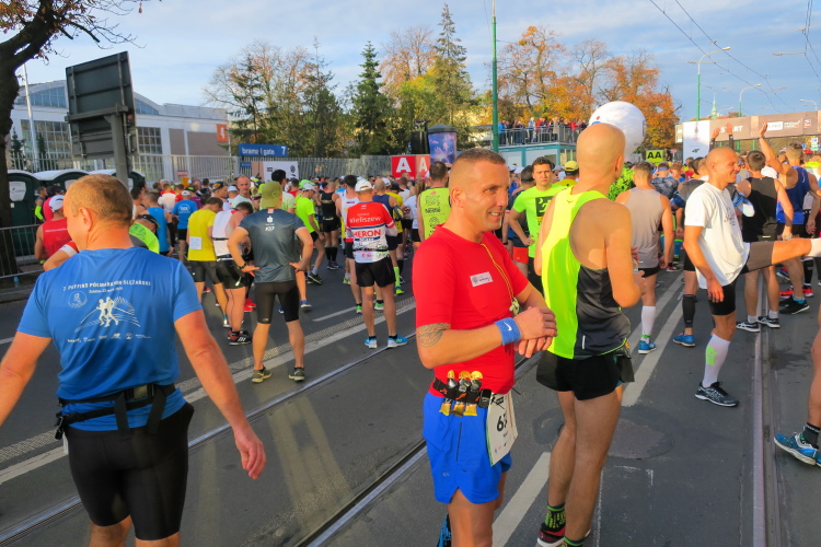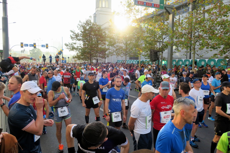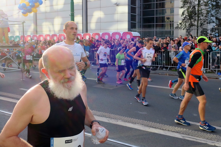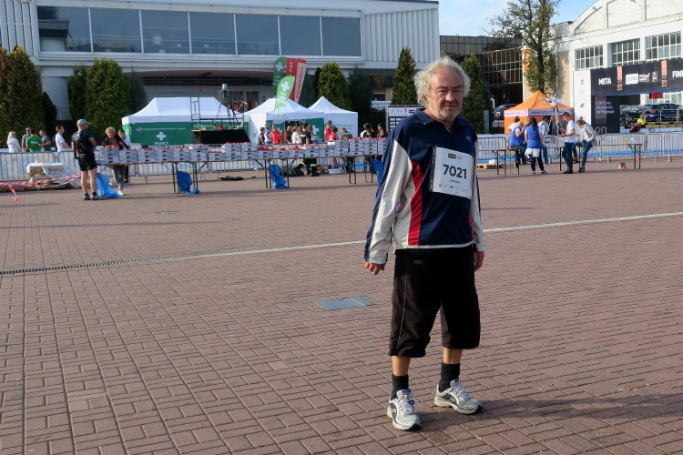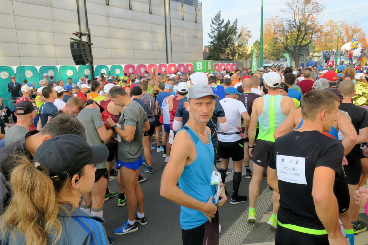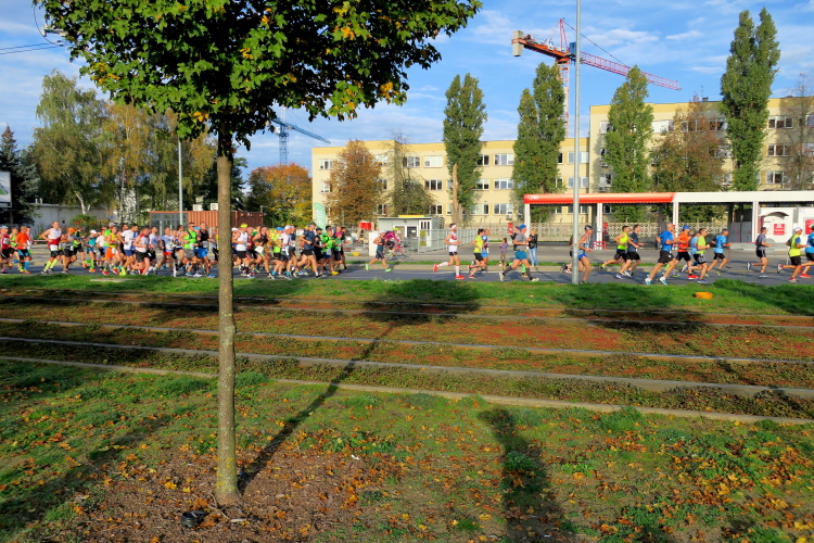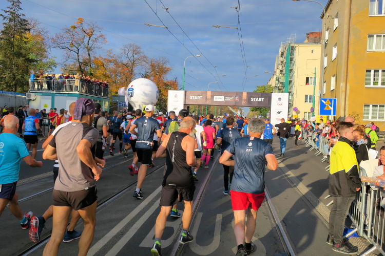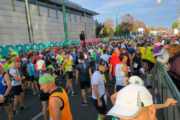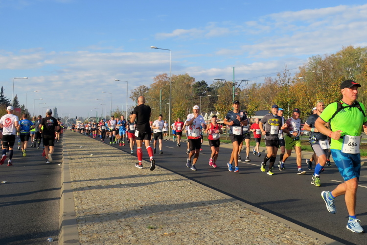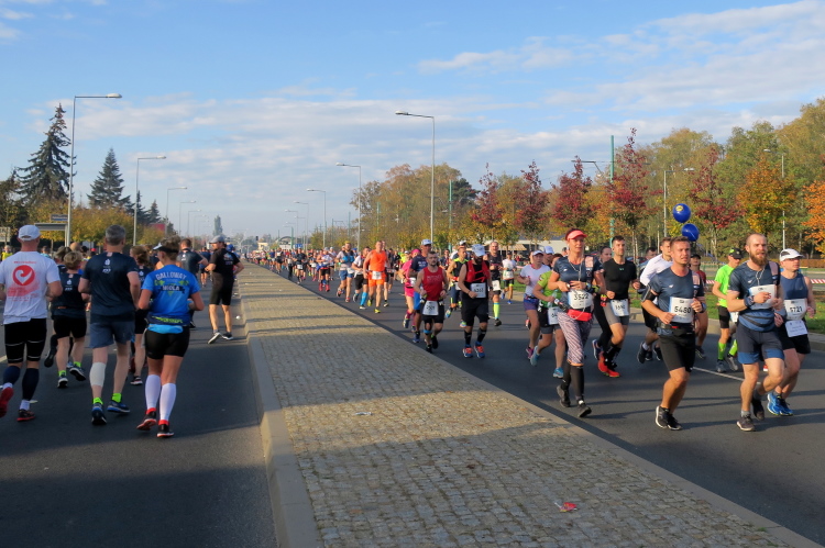 Auf Polnisch wird herabgezählt, „...pięć, cztery, trzy, dwa, jeden, zero“- Los geht’s! Für mich aber noch nicht, ich habe zwar die Uhr gedrückt, um die Brutto- und damit die vermeintliche Schlusszeit genau verfolgen zu können, aber ich stehe an der Absperrung zum Block D und warte bis die Schlange von hinten nachrückt. Dann versuche ich in Tritt zu kommen. Es geht zunächst einige Kilometer nach Südwesten. Noch vor der Labe beim Kilometerpunkt 5 stürmt der mittlerweile bald 76-jährige Stani links und rechts abgeschirmt von jüngeren Kollegen an mir vorbei.