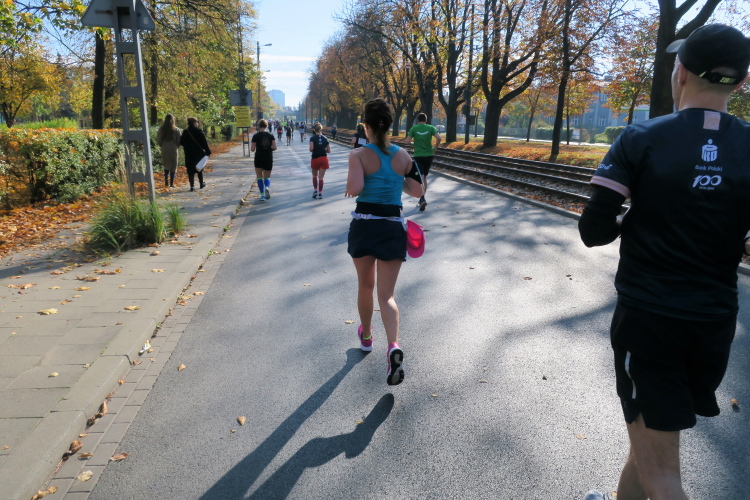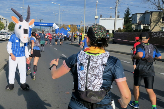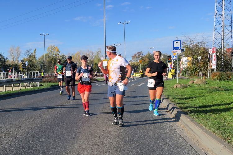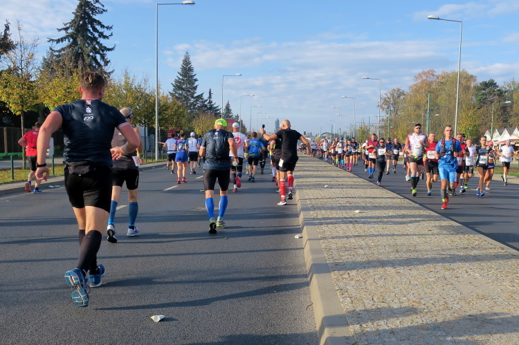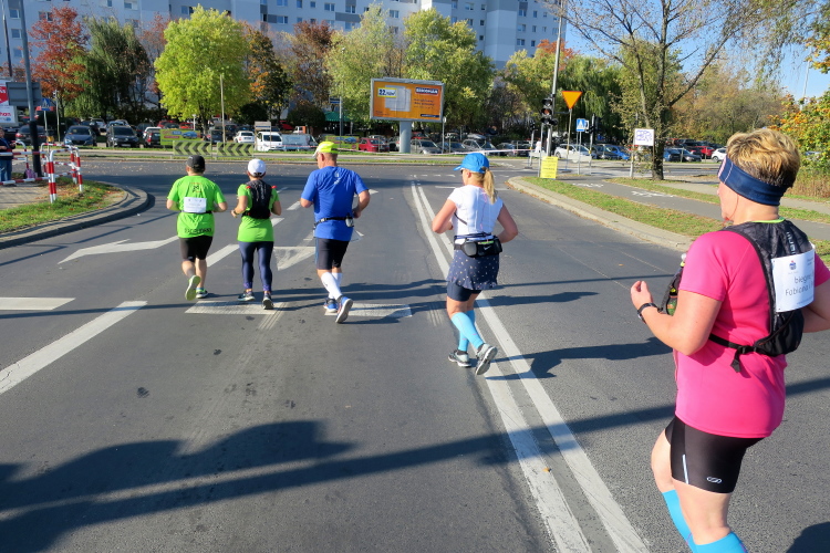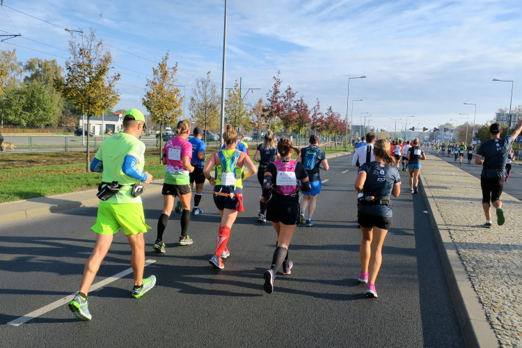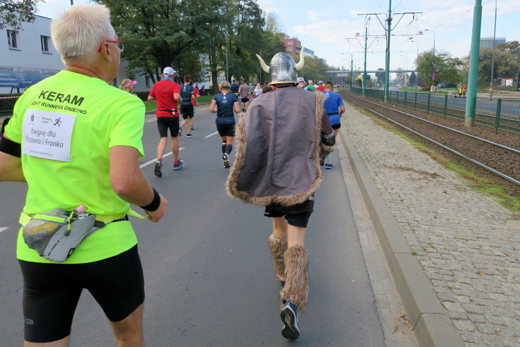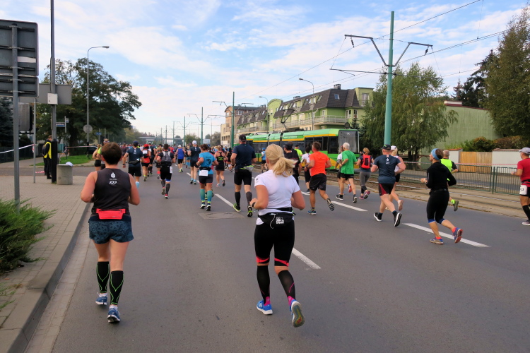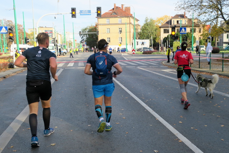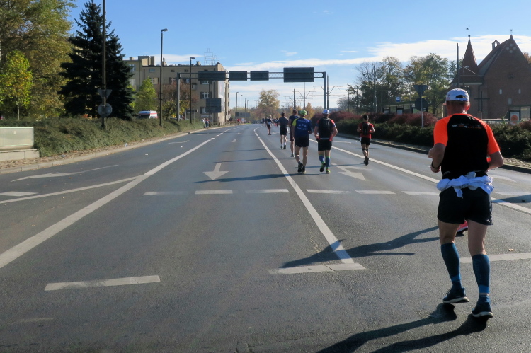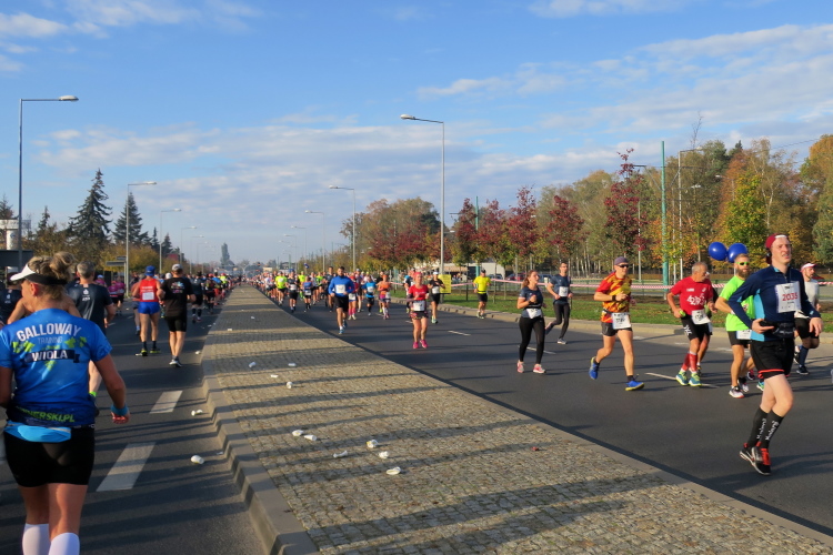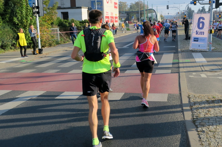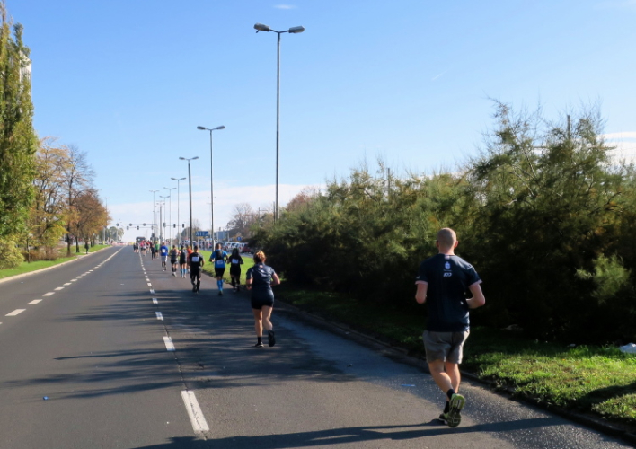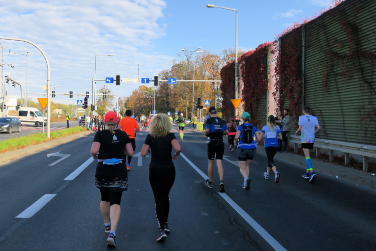 „Beat it!“ – die Drum School von Posen gibt das Tempo vor, nur können wir in der läuferischen Nachhut die Schlagzahl nicht halten. Die Strecke steigt an, auf den folgenden zwei Kilometern sind einige Höhenmeter zu überwinden. Roksanna kommt mit ihrem geliebten Vierbeiner von hinten nach, sie winkt mir zu. Der Hund bleibt immer wieder stehen, alleine würde sie wohl um die 4 Stunden finishen können.