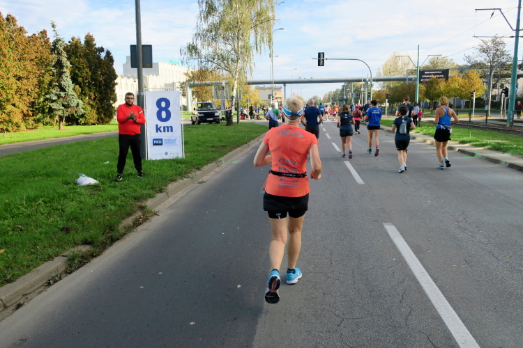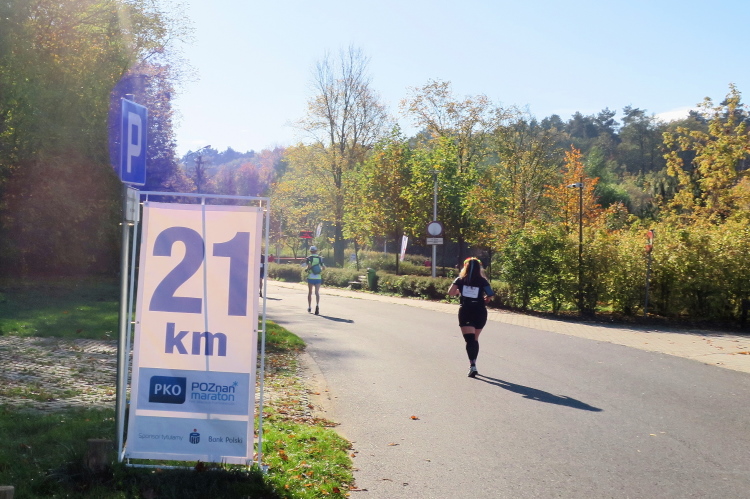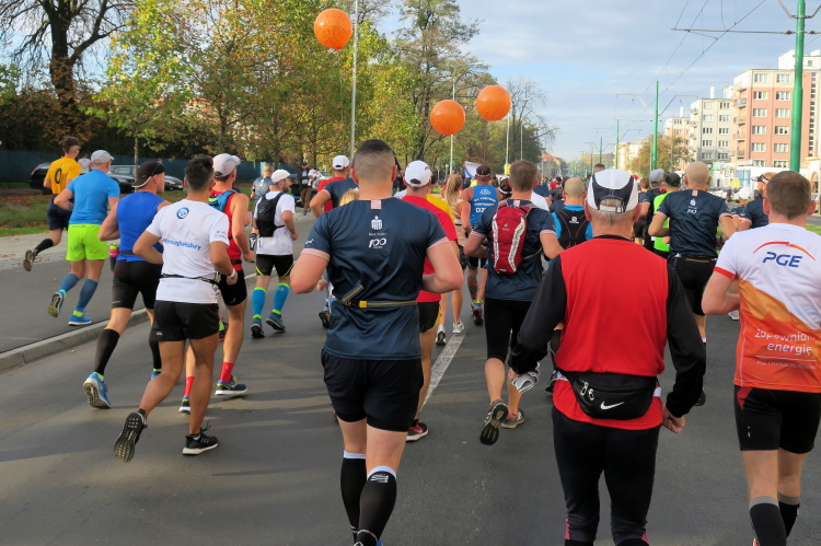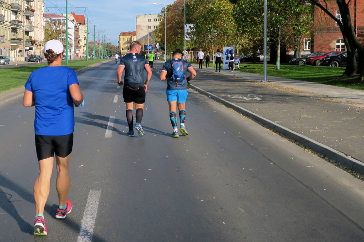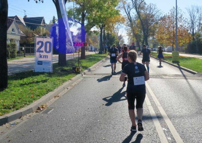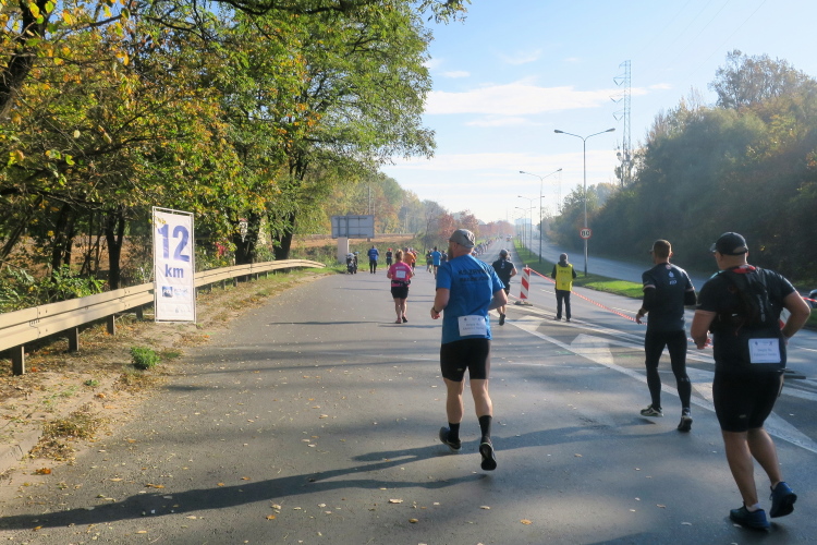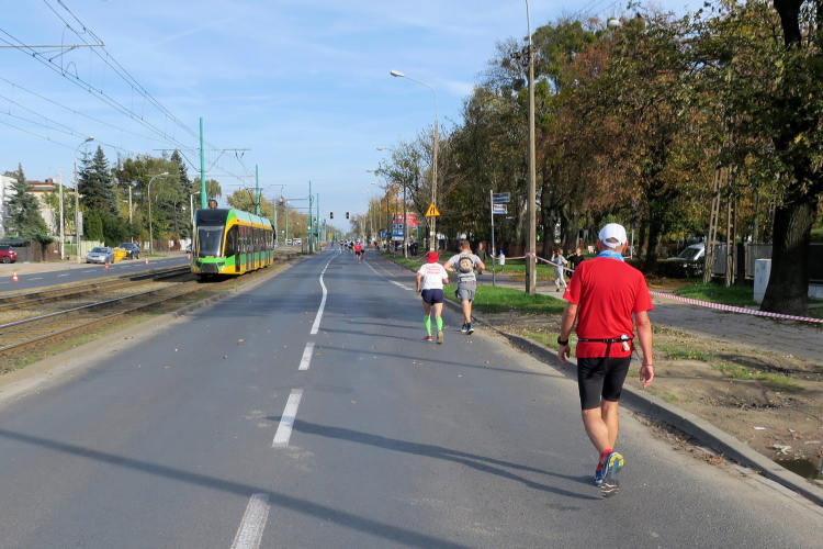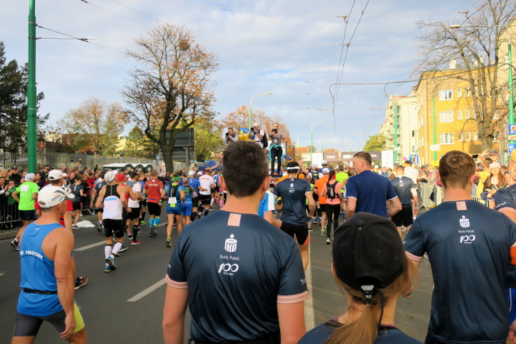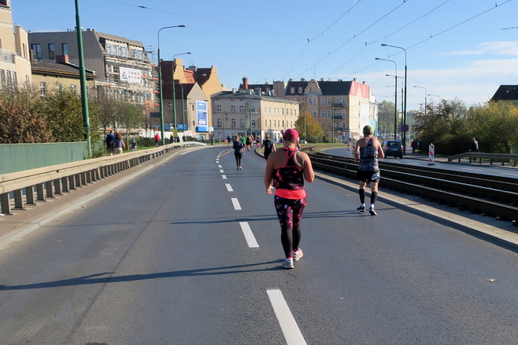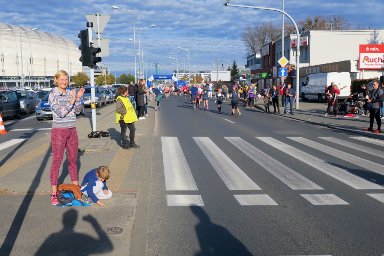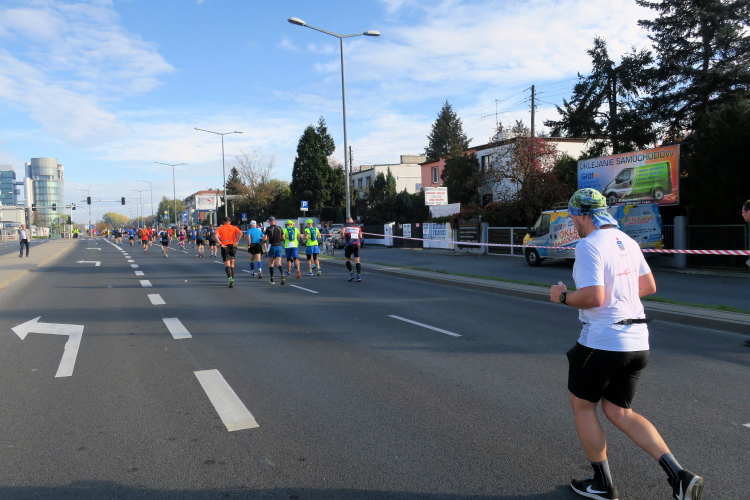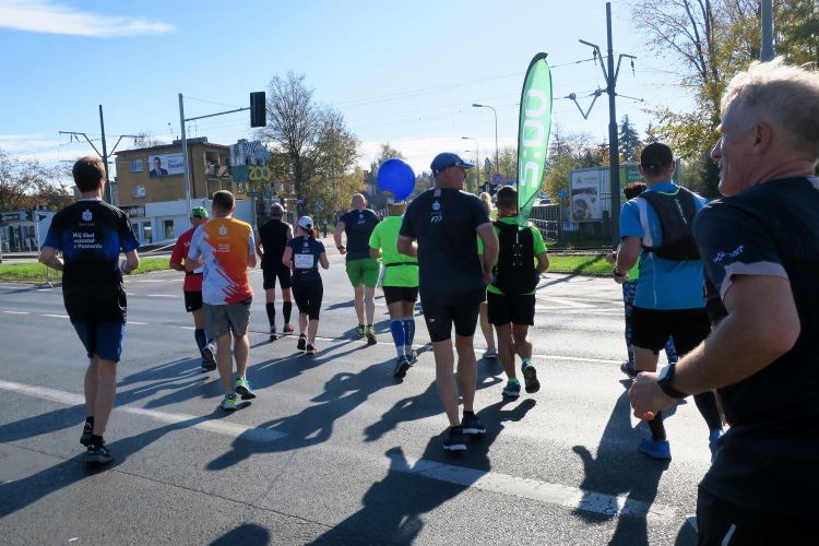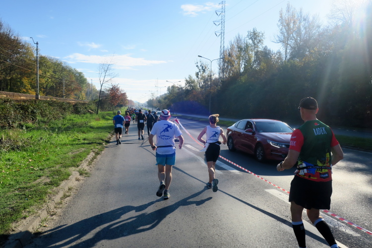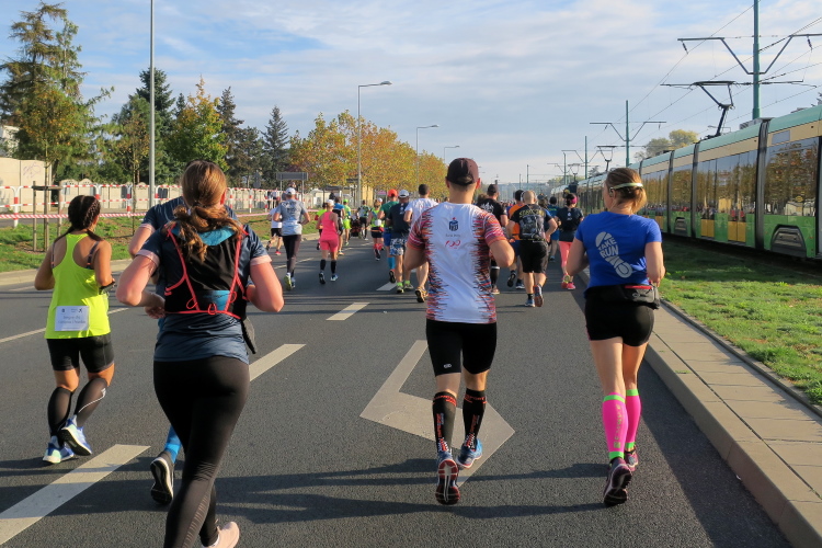 „Beat it!“ – die Drum School von Posen gibt das Tempo vor, nur können wir in der läuferischen Nachhut die Schlagzahl nicht halten. Die Strecke steigt an, auf den folgenden zwei Kilometern sind einige Höhenmeter zu überwinden. Roksanna kommt mit ihrem geliebten Vierbeiner von hinten nach, sie winkt mir zu. Der Hund bleibt immer wieder stehen, alleine würde sie wohl um die 4 Stunden finishen können.