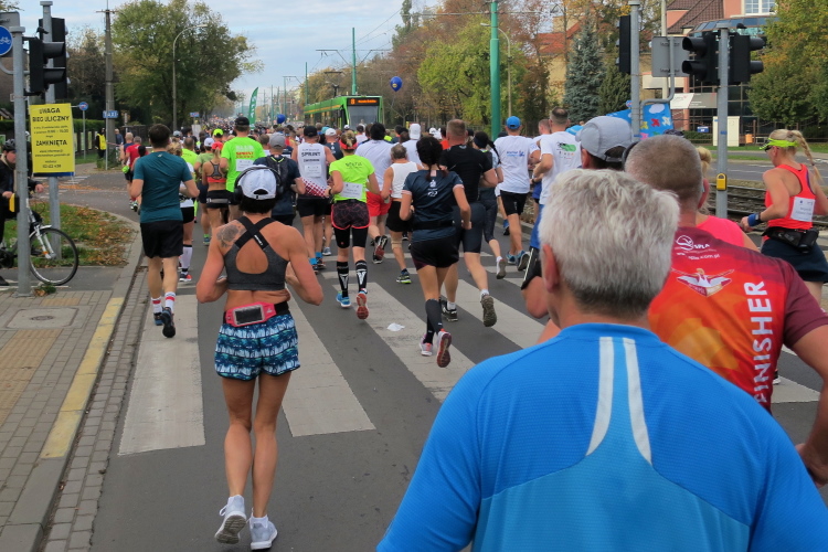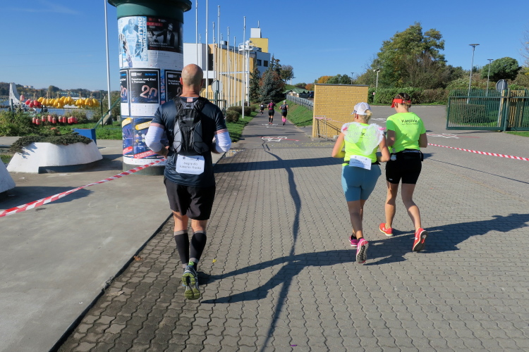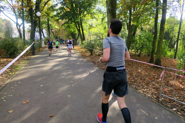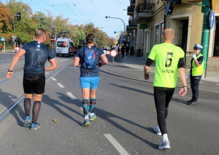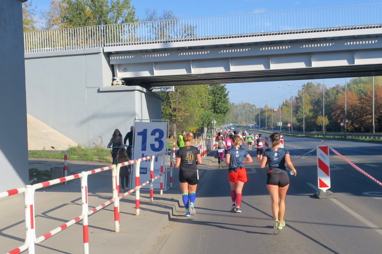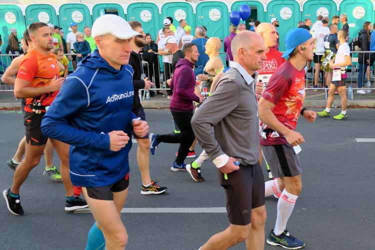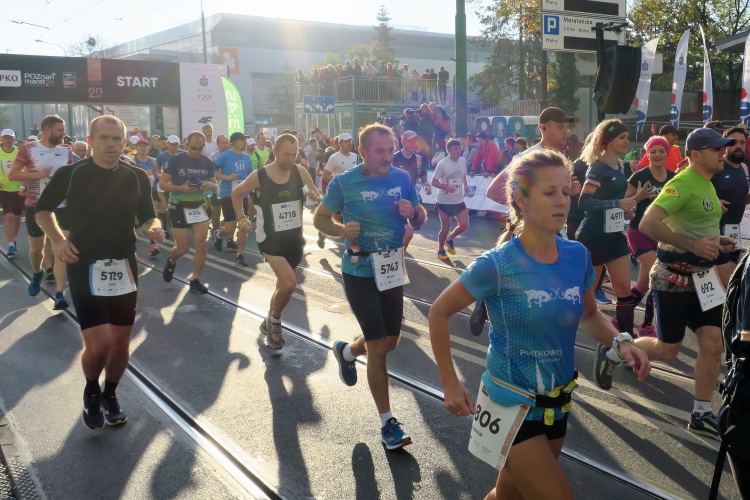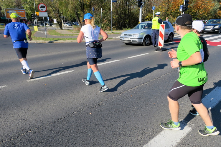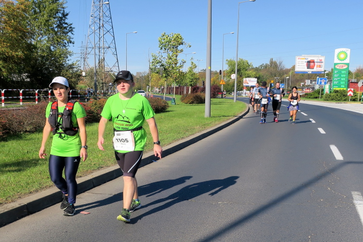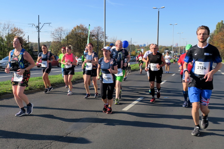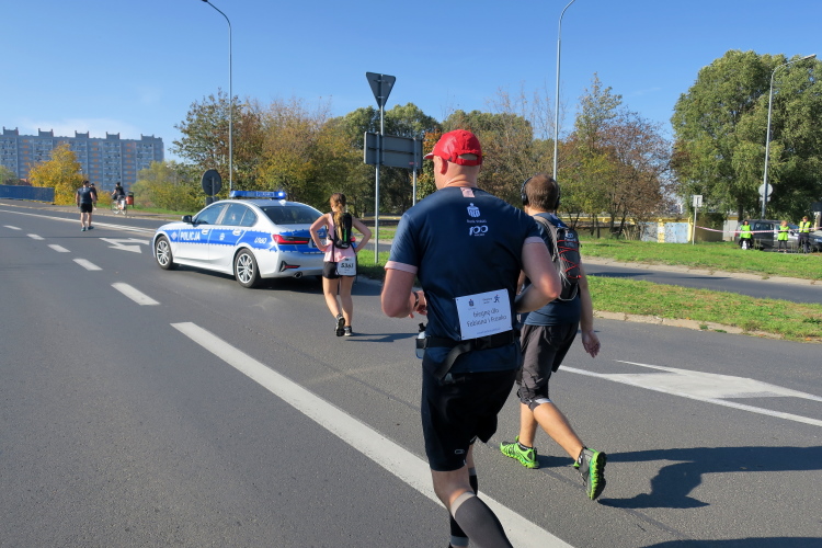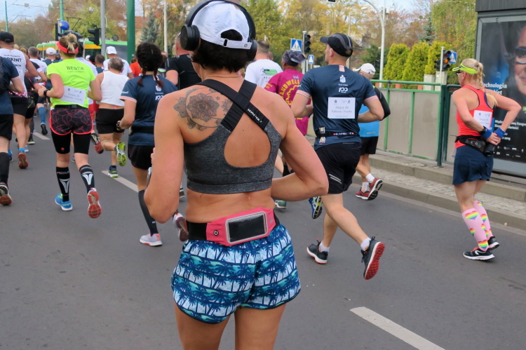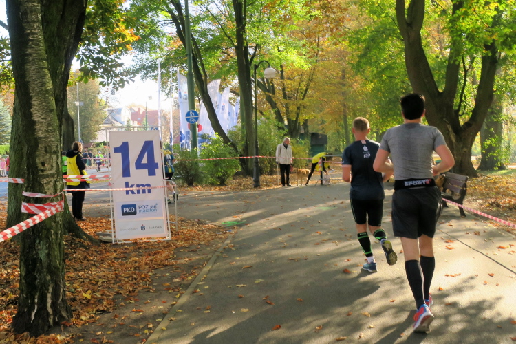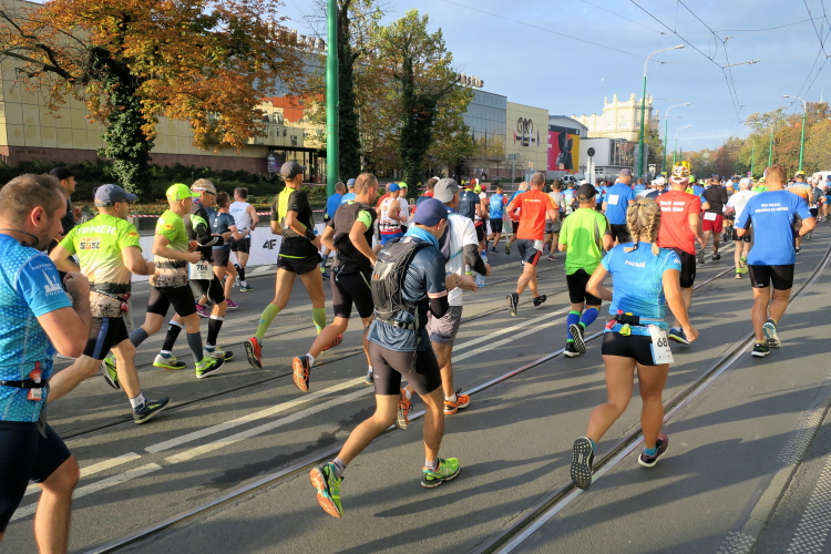 „Beat it!“ – die Drum School von Posen gibt das Tempo vor, nur können wir in der läuferischen Nachhut die Schlagzahl nicht halten. Die Strecke steigt an, auf den folgenden zwei Kilometern sind einige Höhenmeter zu überwinden. Roksanna kommt mit ihrem geliebten Vierbeiner von hinten nach, sie winkt mir zu. Der Hund bleibt immer wieder stehen, alleine würde sie wohl um die 4 Stunden finishen können.