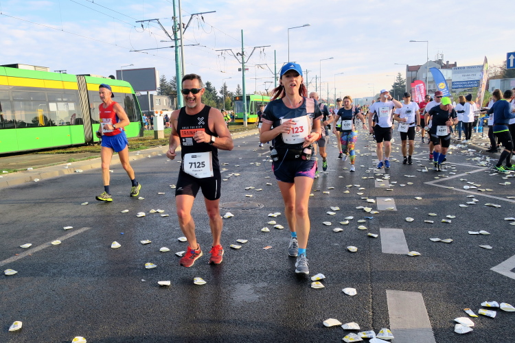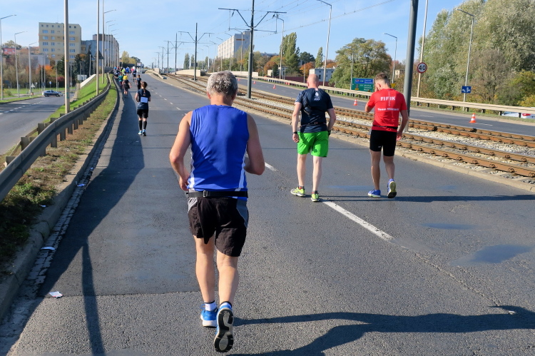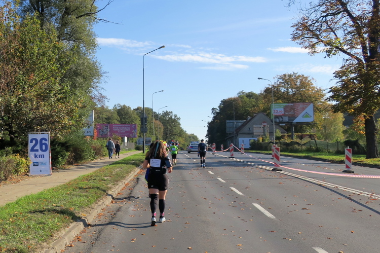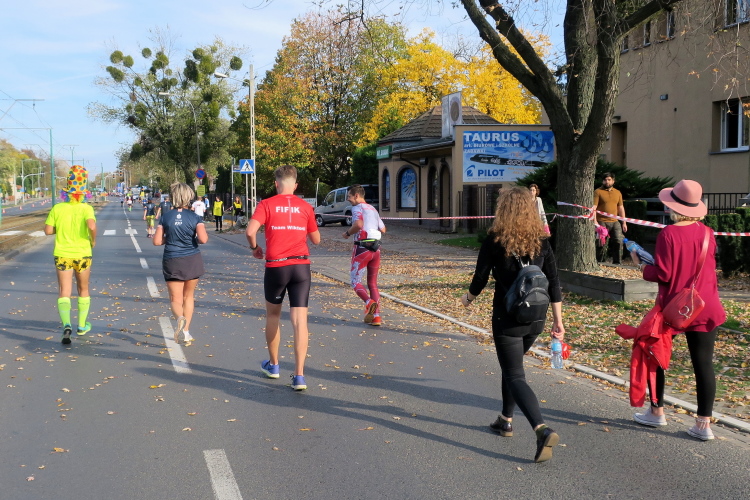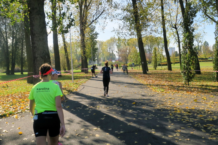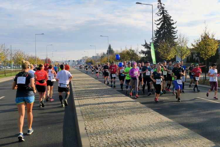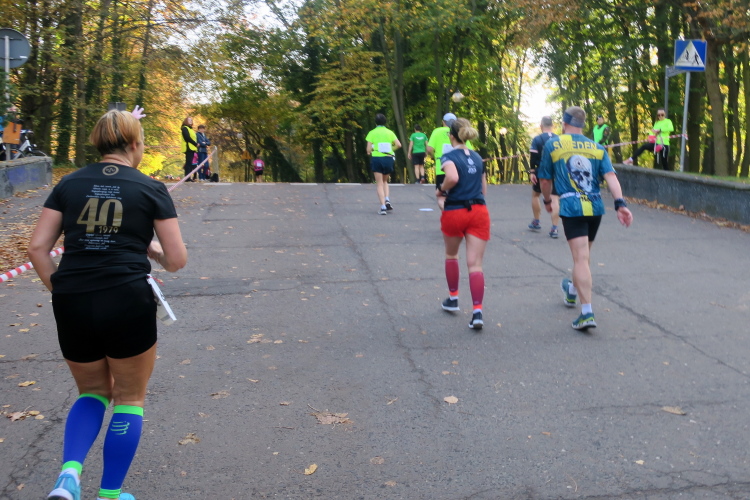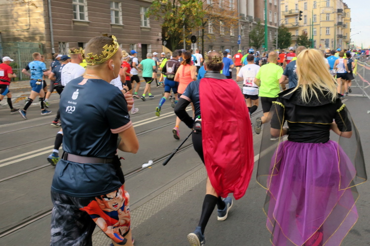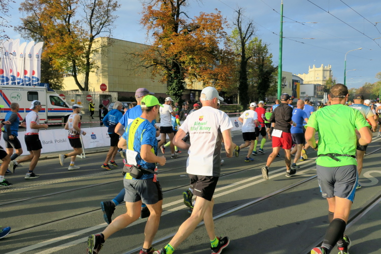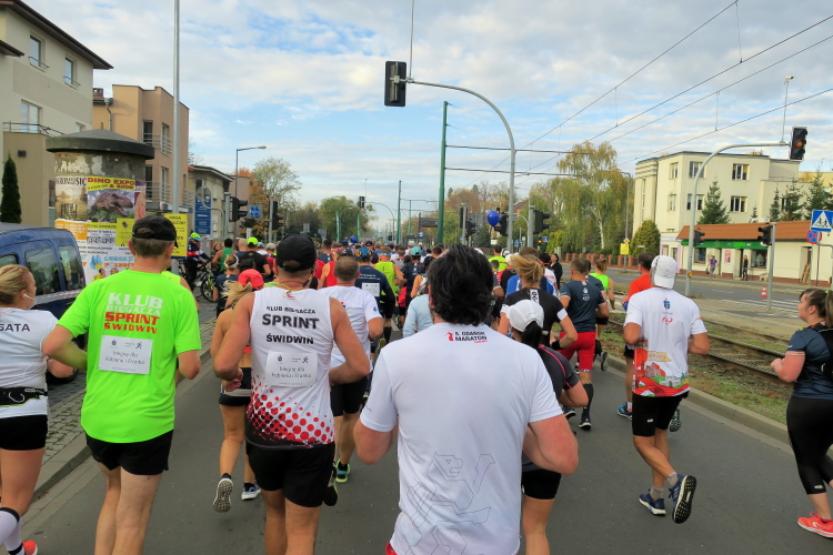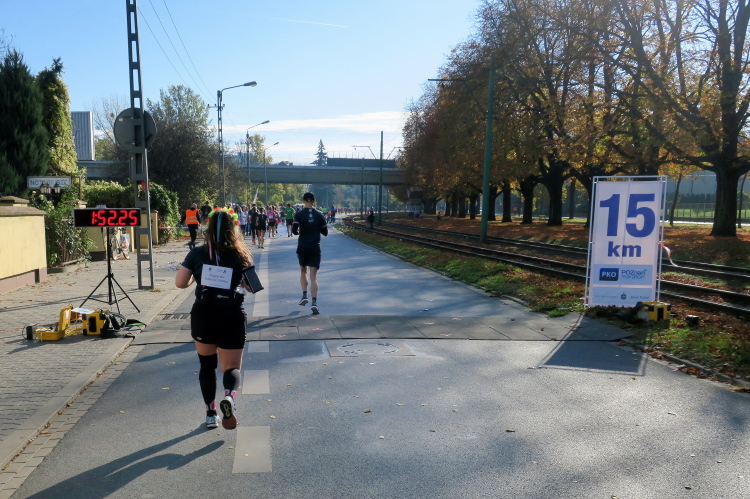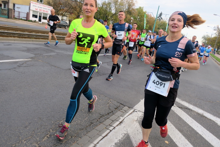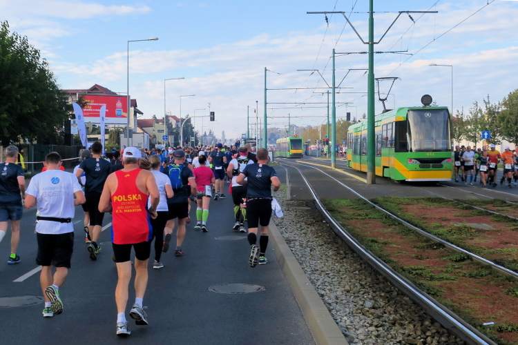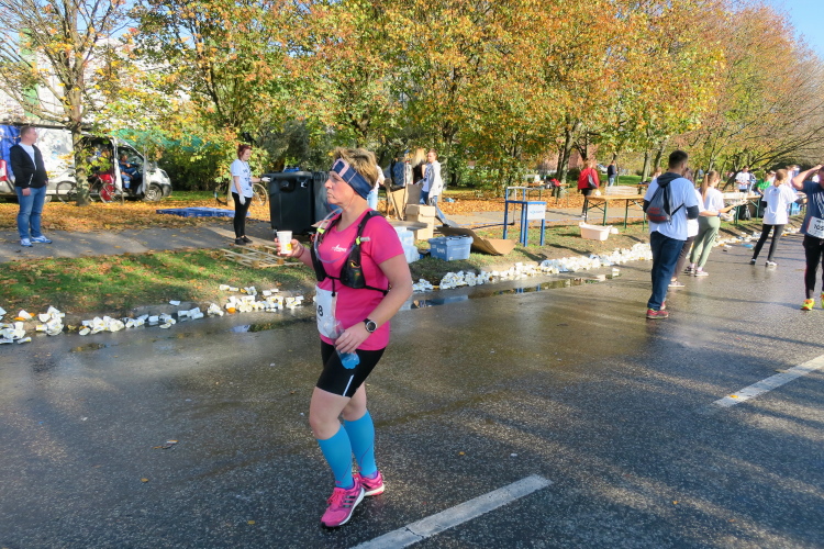 „Beat it!“ – die Drum School von Posen gibt das Tempo vor, nur können wir in der läuferischen Nachhut die Schlagzahl nicht halten. Die Strecke steigt an, auf den folgenden zwei Kilometern sind einige Höhenmeter zu überwinden. Roksanna kommt mit ihrem geliebten Vierbeiner von hinten nach, sie winkt mir zu. Der Hund bleibt immer wieder stehen, alleine würde sie wohl um die 4 Stunden finishen können.