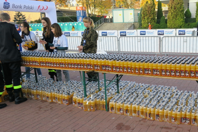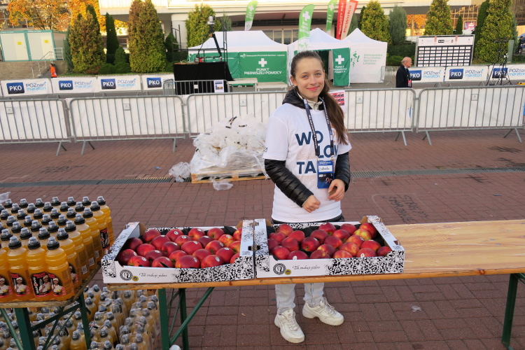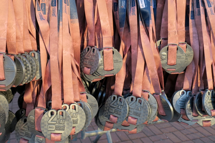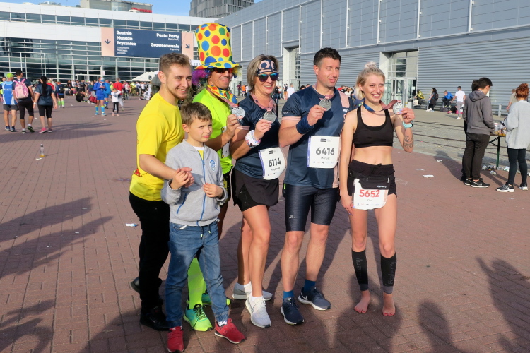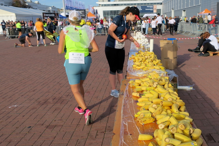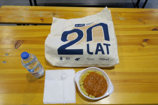Ich bekomme rasch einen Platz für die Gratismassage. Auch ohne Bon bekomme ich nachher in der Halle netterweise eine weitere Nudelportion. Roksanna gesellt sich zu mir, leider sind die Nudeln inzwischen aus – ich trete den Rest meines Tellers an ihren Hund ab, der wie sie als Finisher eine Medaille bekommen hat. Sie weiß zu berichten, dass in Poznan die Organisation intensiv das ganze Jahr für diese so bedeutenden und inzwischen größten Lauf in Polen arbeitet.