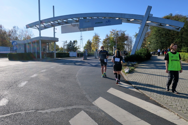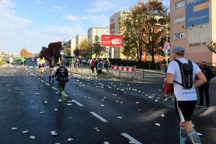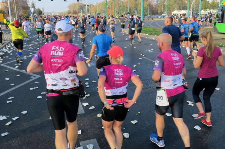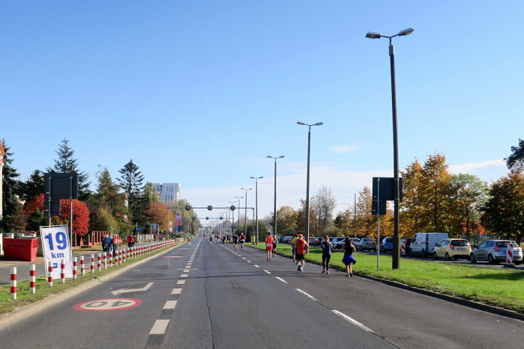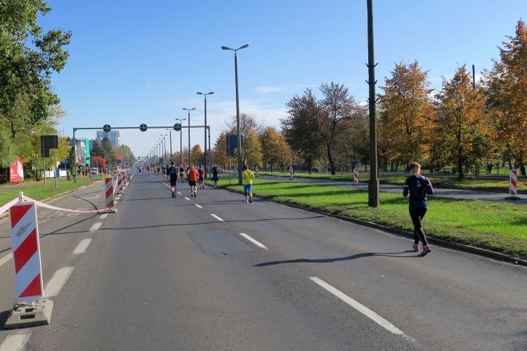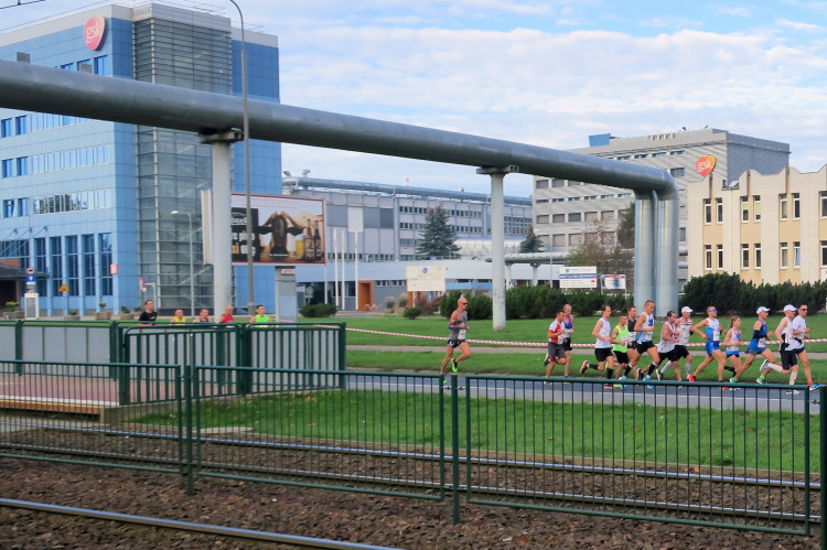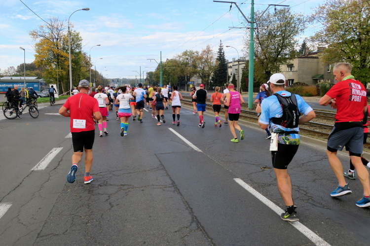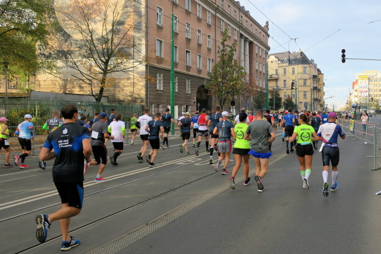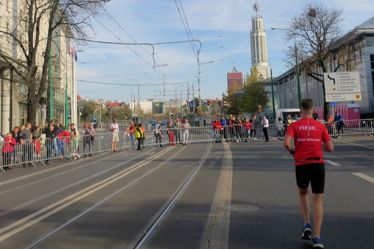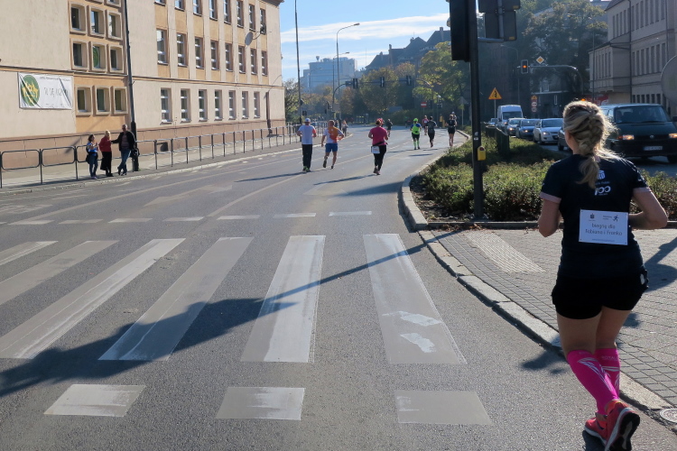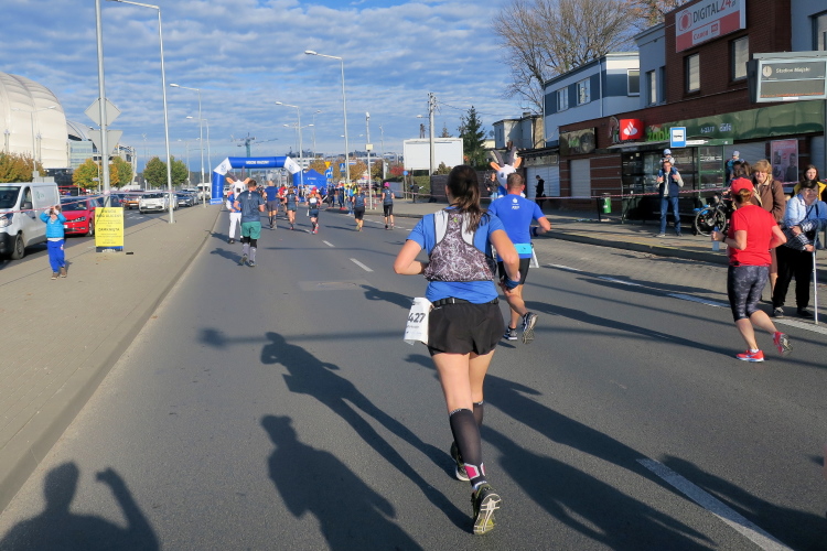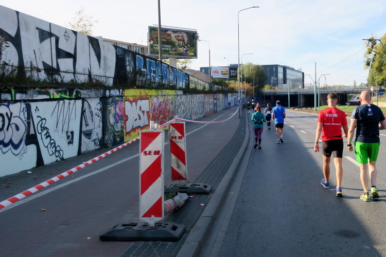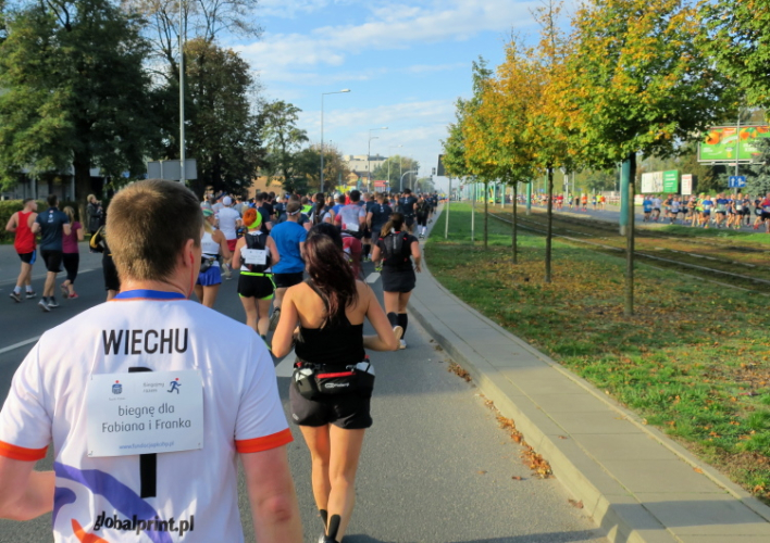 Es geht durch Wohn- und Industriegebiet weiter stadteinwärts. Auffallend sind die riesigen Plattenbauten, wie man sie von Wohnsilos in den typischen ehemaligen Ostblockstaaten kennt. Viele sind Neubauten, ältere Gebäude werden mit bunter Fassadenfarbe überkleckert und bekommen so ein neues Antlitz. Eine Dreiergruppe kämpft sich tapfer voran. Einmal sind sie vor mir, dann fällt die Frau in der Runde wieder zurück – die Männer warten, bis sie wieder anschließen kann. Inzwischen haben zahlreiche Läufer ihren am Shirt rückwärts angehefteten Aufdruck „Biegnę dla Fabiana i Franka“ verloren, eine Charity-Aktion für Fabian und Frank, an der man sich mit einer Spende beteiligen kann.