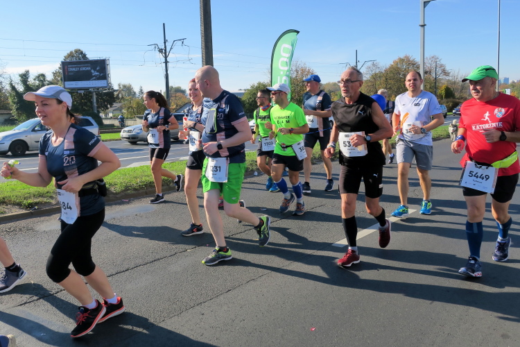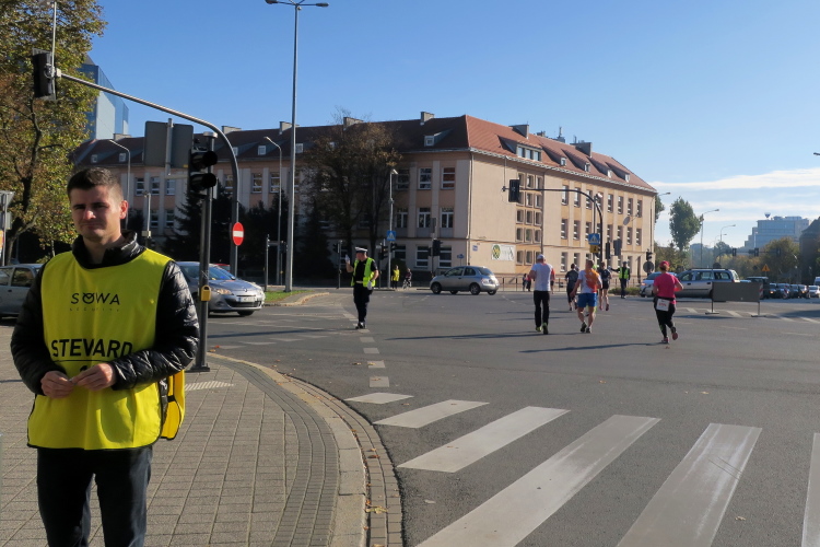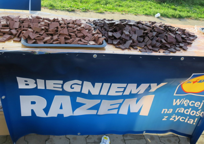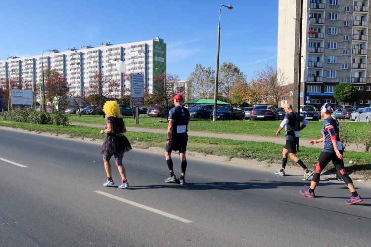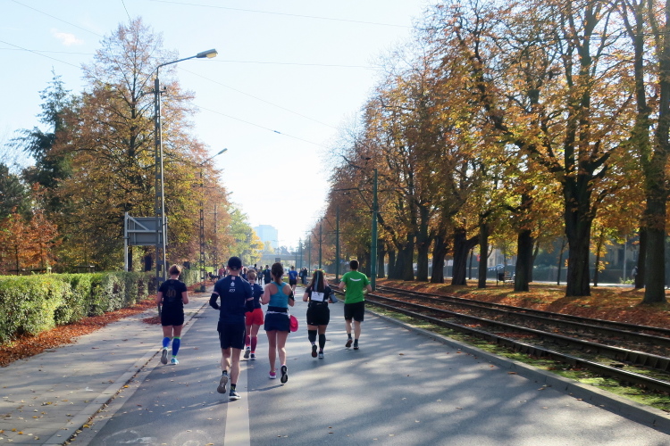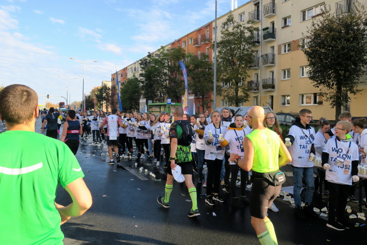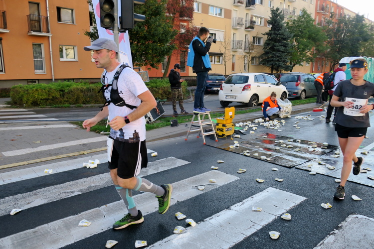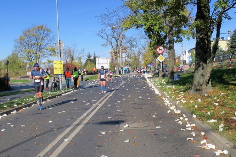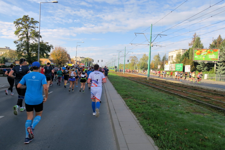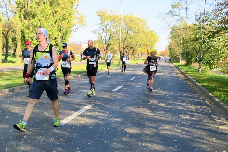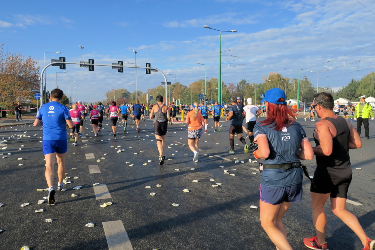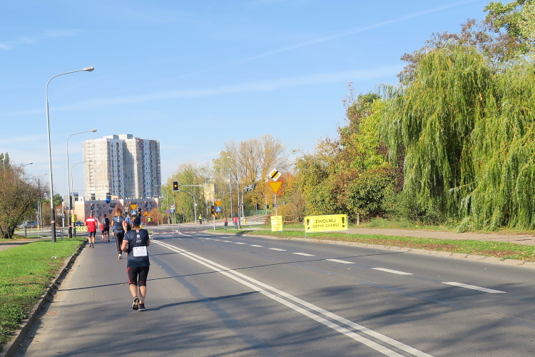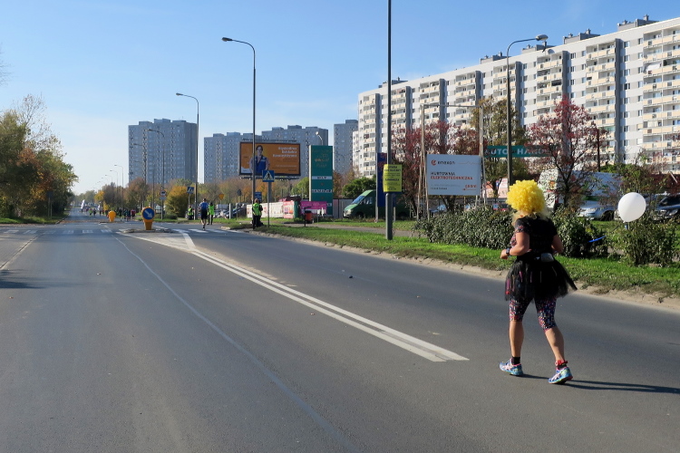 Es geht durch Wohn- und Industriegebiet weiter stadteinwärts. Auffallend sind die riesigen Plattenbauten, wie man sie von Wohnsilos in den typischen ehemaligen Ostblockstaaten kennt. Viele sind Neubauten, ältere Gebäude werden mit bunter Fassadenfarbe überkleckert und bekommen so ein neues Antlitz. Eine Dreiergruppe kämpft sich tapfer voran. Einmal sind sie vor mir, dann fällt die Frau in der Runde wieder zurück – die Männer warten, bis sie wieder anschließen kann. Inzwischen haben zahlreiche Läufer ihren am Shirt rückwärts angehefteten Aufdruck „Biegnę dla Fabiana i Franka“ verloren, eine Charity-Aktion für Fabian und Frank, an der man sich mit einer Spende beteiligen kann.