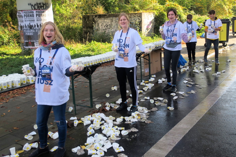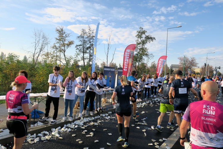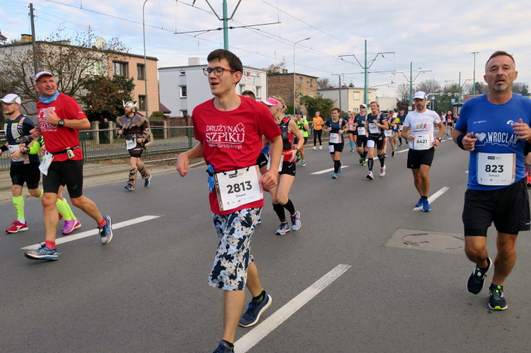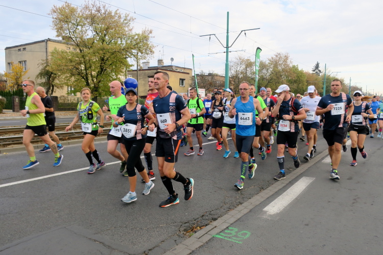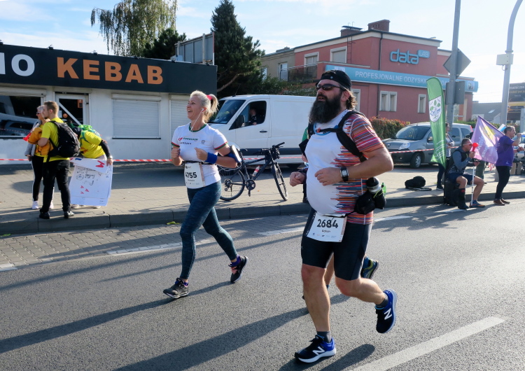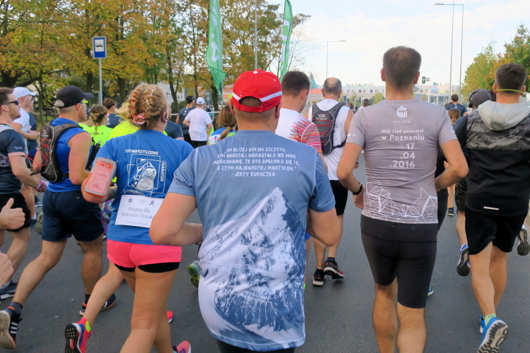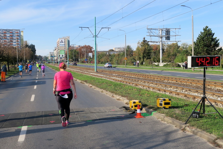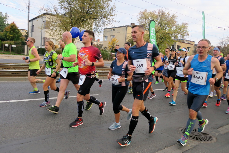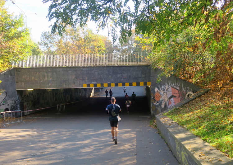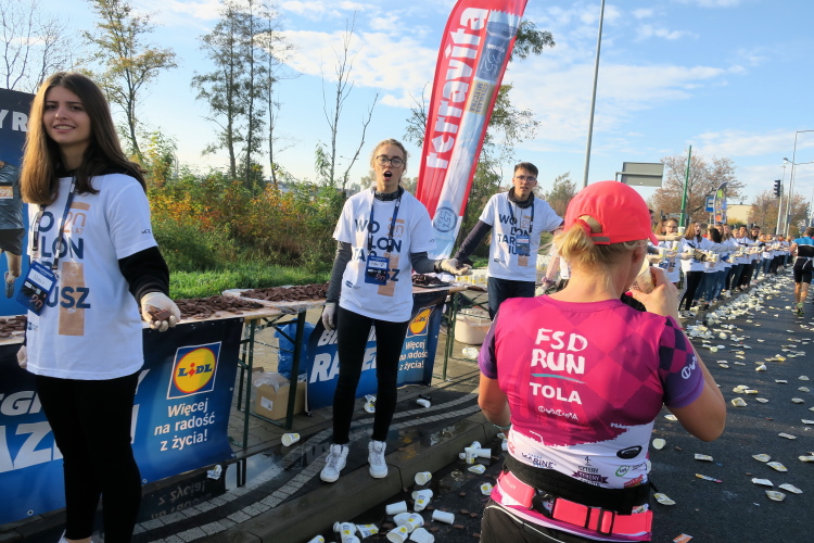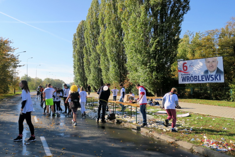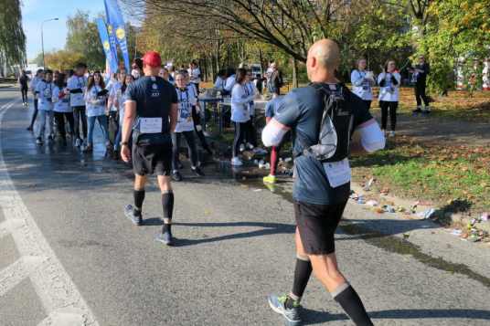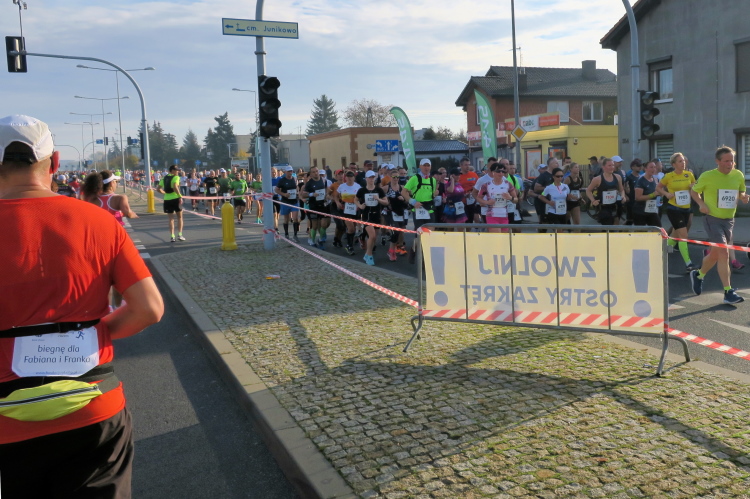 Es geht durch Wohn- und Industriegebiet weiter stadteinwärts. Auffallend sind die riesigen Plattenbauten, wie man sie von Wohnsilos in den typischen ehemaligen Ostblockstaaten kennt. Viele sind Neubauten, ältere Gebäude werden mit bunter Fassadenfarbe überkleckert und bekommen so ein neues Antlitz. Eine Dreiergruppe kämpft sich tapfer voran. Einmal sind sie vor mir, dann fällt die Frau in der Runde wieder zurück – die Männer warten, bis sie wieder anschließen kann. Inzwischen haben zahlreiche Läufer ihren am Shirt rückwärts angehefteten Aufdruck „Biegnę dla Fabiana i Franka“ verloren, eine Charity-Aktion für Fabian und Frank, an der man sich mit einer Spende beteiligen kann.