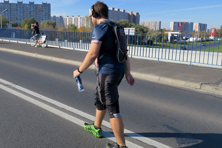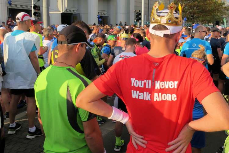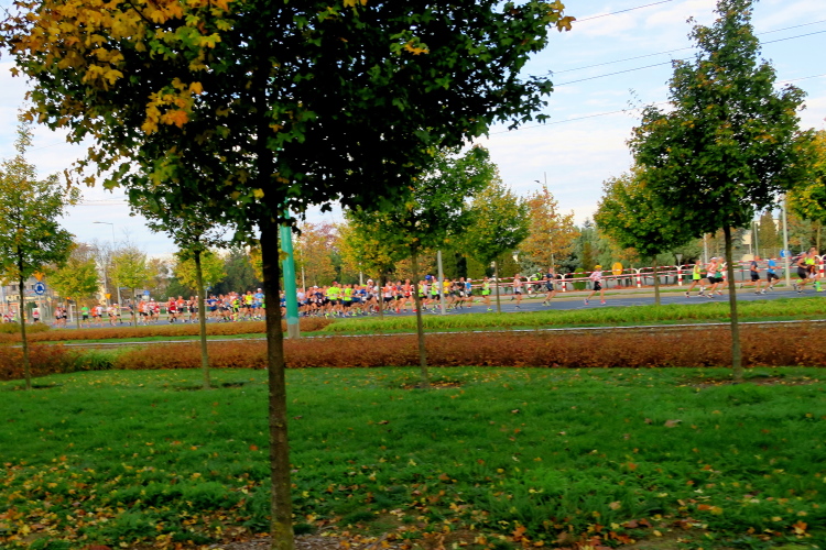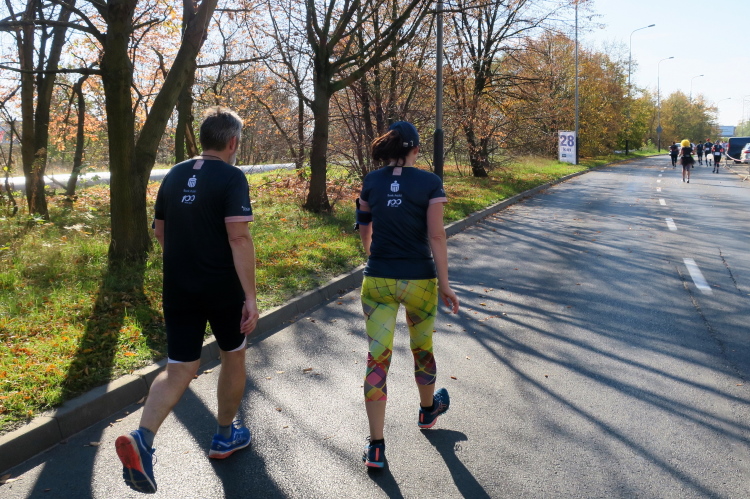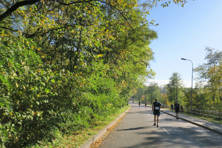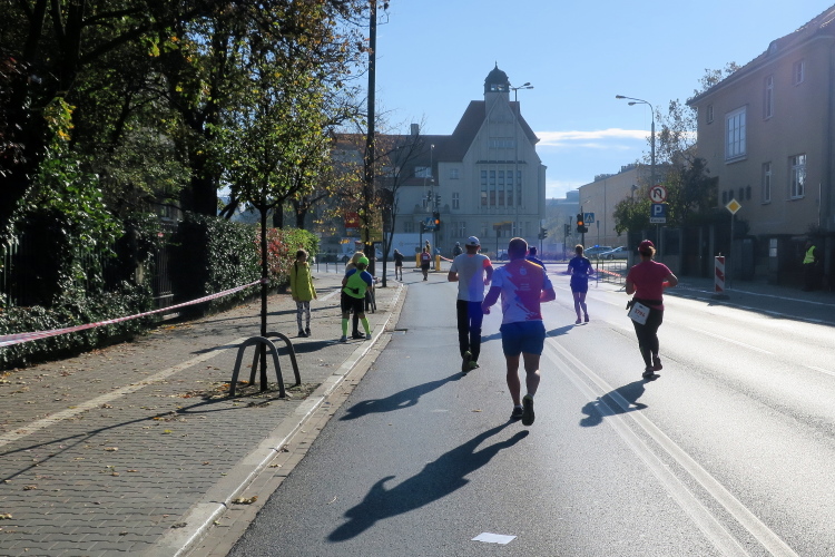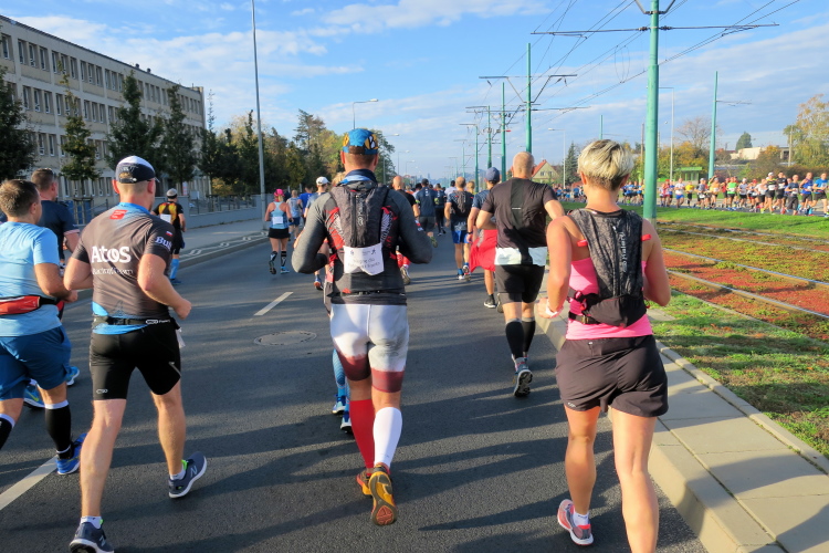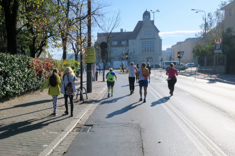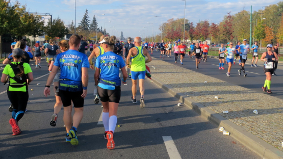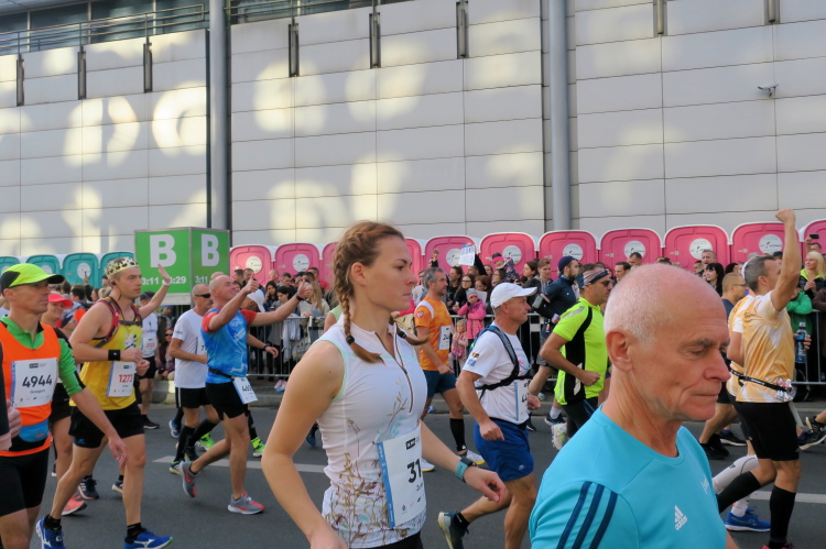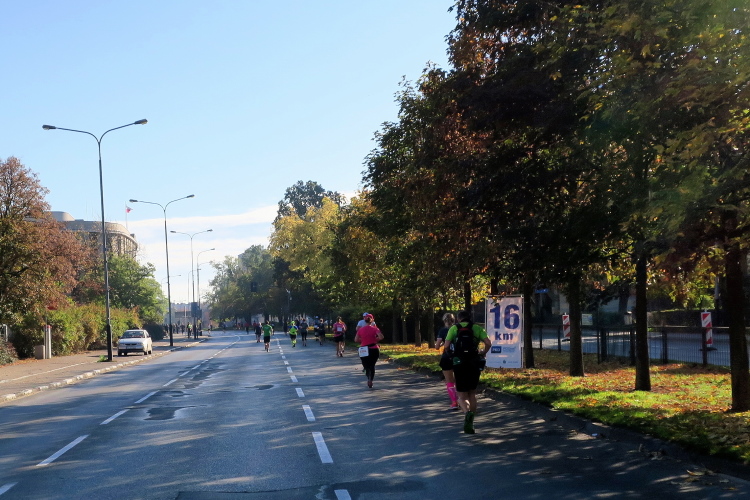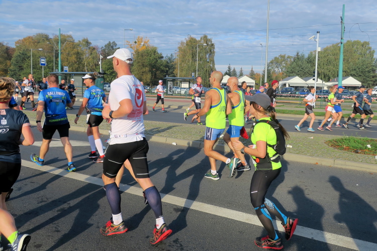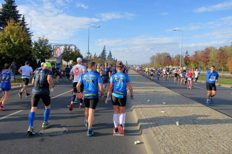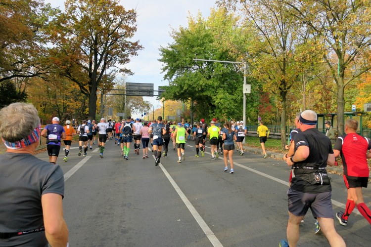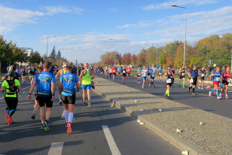 Interessiert verfolge ich die Lauftaktik eines polnischen Pärchens – sie sind überzeugte Anhänger der Galloway-Methode mit dazu passendem Shirt. Abwechselnd kurze schnelle Laufeinheiten und dann zur Erholung wieder schnelles Gehen – so kann man ev. auch unter 5 Stunden finishen. Die Läufer auf der anderen Straßenseite sind nur durch einen zwei Meter breiten gepflasterten Mittelstreifen getrennt, man könnte fast hinübergreifen und abklatschen. Dann geht es auch für mich auf einem spürbaren leichten Anstieg zurück. Es kommen noch viele nach, das Feld ist nach inzwischen 8 Kilometern sehr weit auseinandergezogen. Die 5 Stunden-Pacergruppe liegt überraschend noch zurück, sie dürfte weit hinten im Block E gestartet sein.