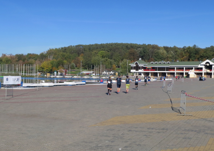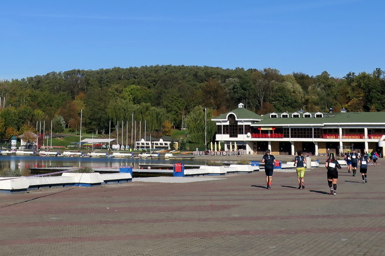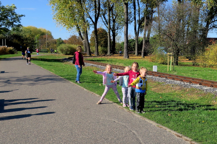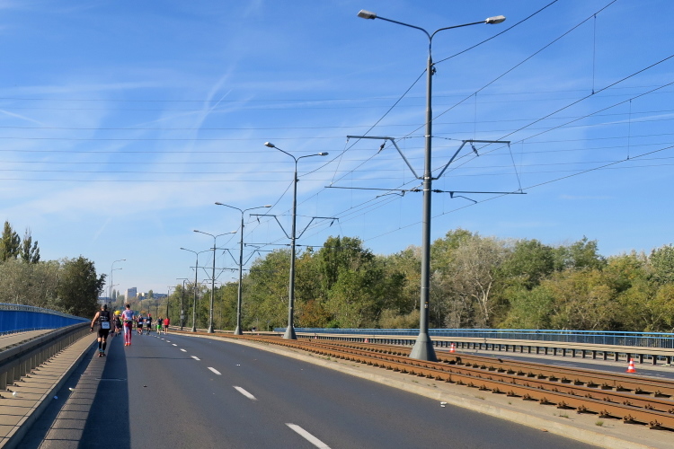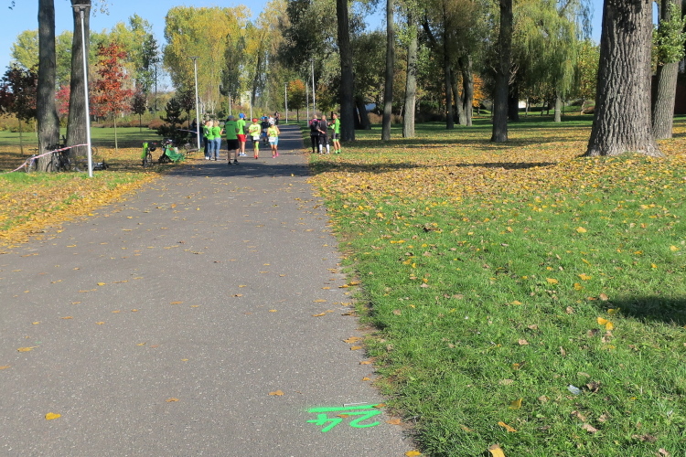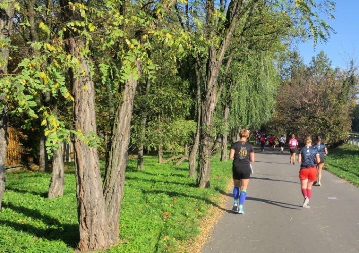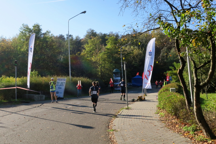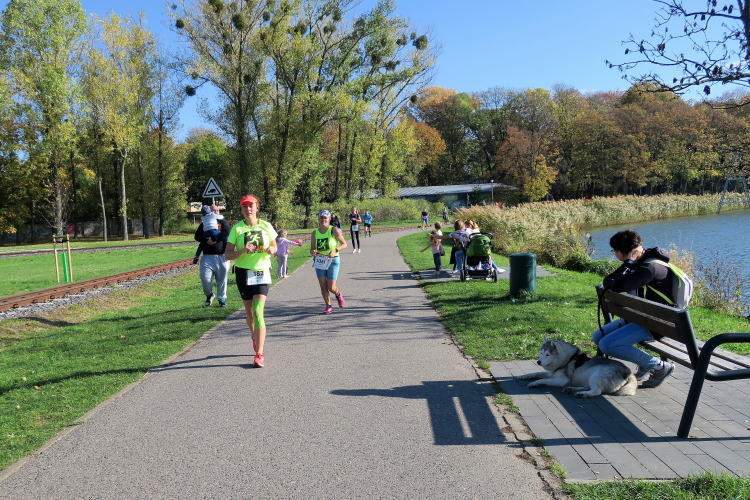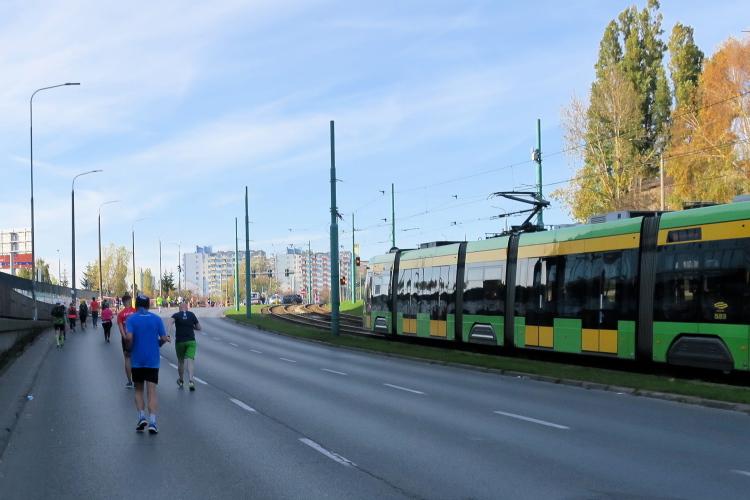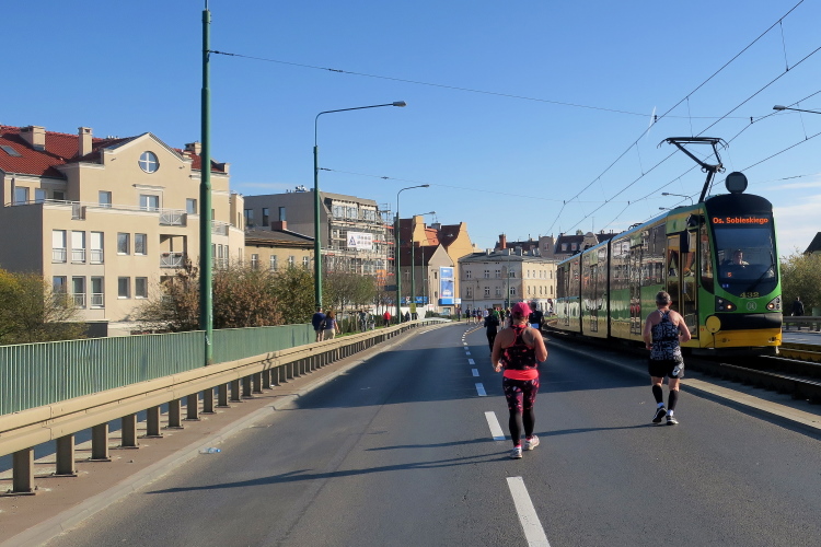 Bei der 21.097 km-Anzeige geht es in einer Schleife zunächst am Spazierweg des tiefer liegenden Wassersportzentrum Maltasee, durch Stauung des Flusses Cybina 1952 künstlich angelegt, wieder stadteinwärts. Auf der Regattastrecke der Anlage wurden 2009 die Ruderweltmeisterschaften ausgetragen. Am Südufer befindet sich das Sport- und Erholungszentrum Malta-Ski mit einem ganzjährig befahrbaren Skihang, einer Sommerrodelbahn, sowie eine Minigolfanlage. Auf diesem Abschnitt kann ich mich wieder besser in Szene setzen und an zahlreichen Gehern vorbeitraben. Es finden kleine Positionskämpfe statt, aber immer nur unter den Langsamen, sodass man sich schließlich schon ein wenig näher gekommen ist und der Smalltalk beginnt. Paulina erzählt, dass sie heuer in Wien gelaufen ist und heute unbedingt noch unter 5:30 finishen will. Karolina und ihre Lauffreundin, beide im neonfarbenen Shirt, wollen unbedingt an mir vorbei. Aber nach jedem Versuch habe ich sie bald wieder eingeholt. Ich bemühe mich, mit einigen Kleinkindern abzuklatschen, dafür muss ich mich mir meinen 1.92 cm Körpergröße ordentlich bücken.