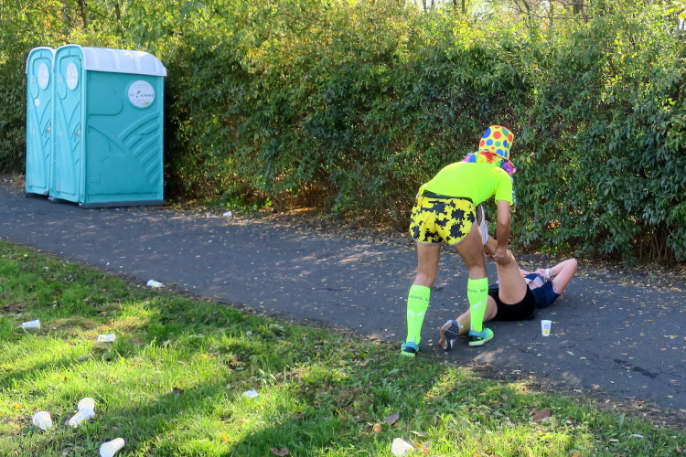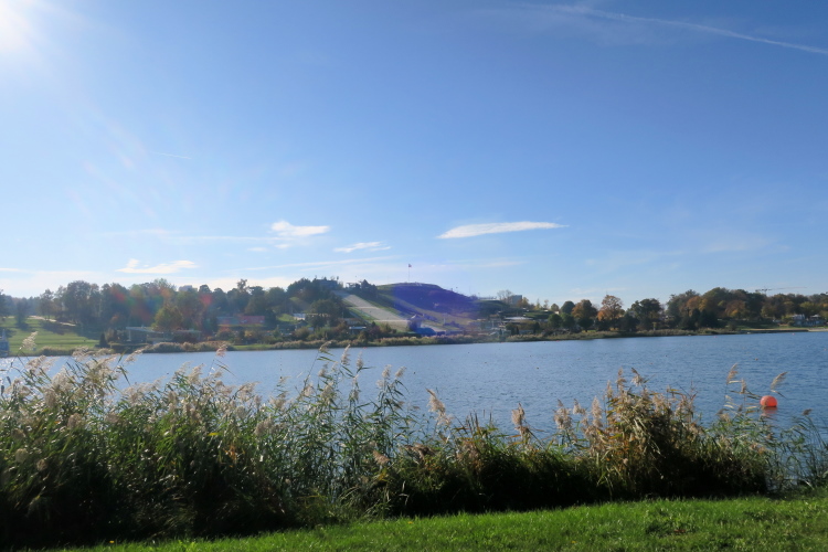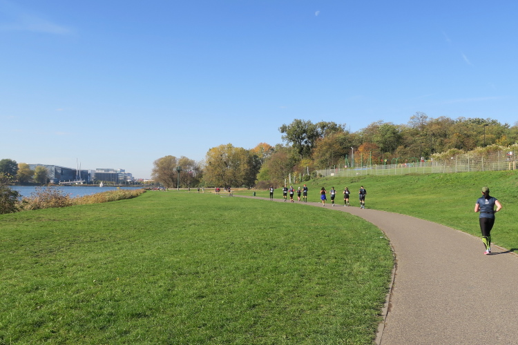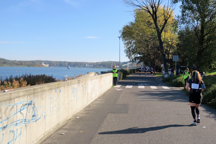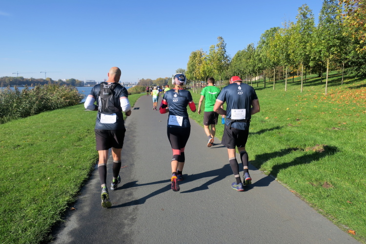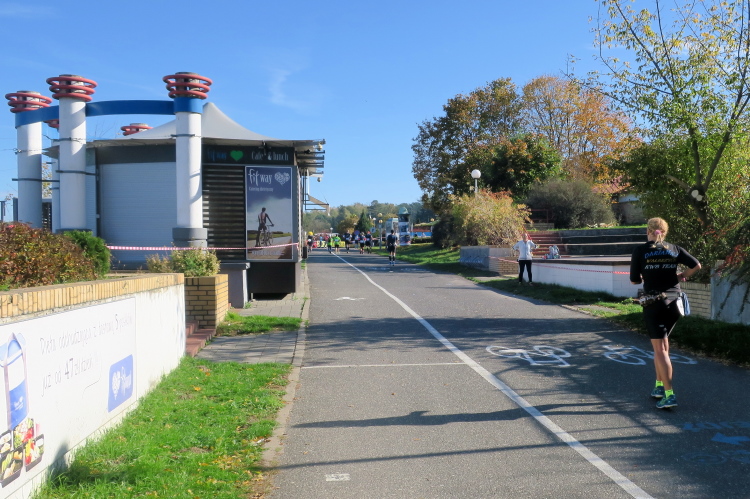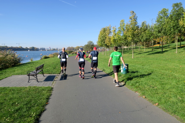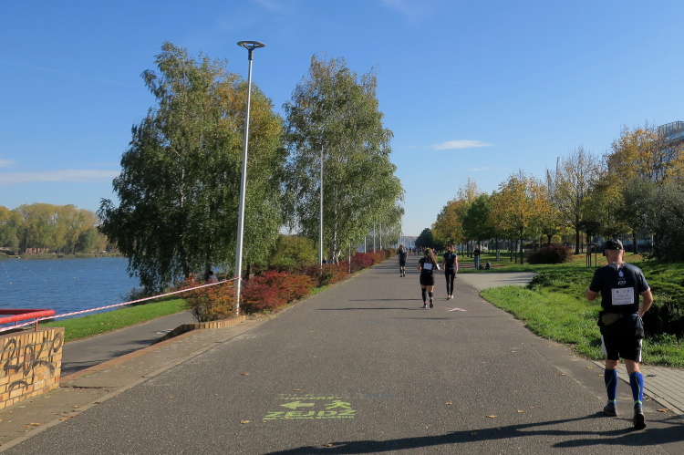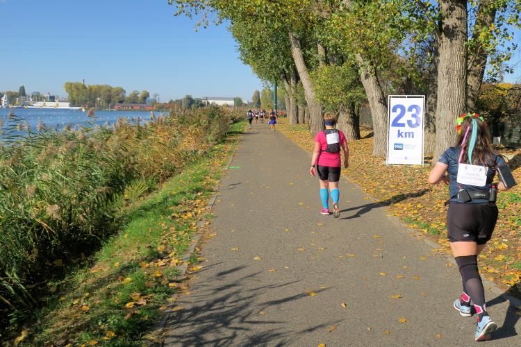 Die Strecke führt in diesem Abschnitt um den ganzen See herum, bei Kilometer 25 wird wieder gemessen – und üppig versorgt. Nach Kilometer 26 dreht der Kurs wieder in einer langgezogenen Schleife stadteinwärts. Bei Kilometer 27 hole ich Paulina wieder ein. Ihre angestrebten 5:30 werden schwer zu erreichen sein.