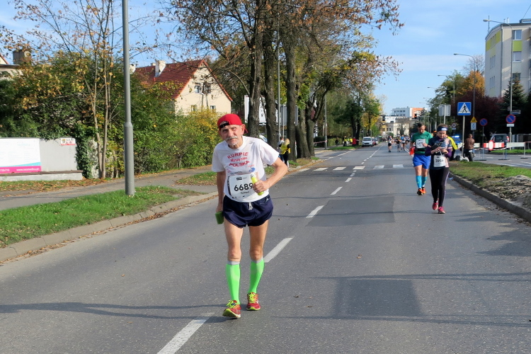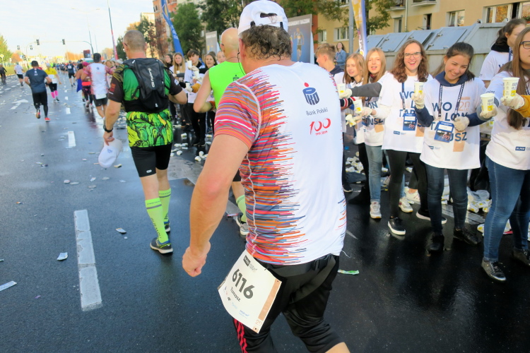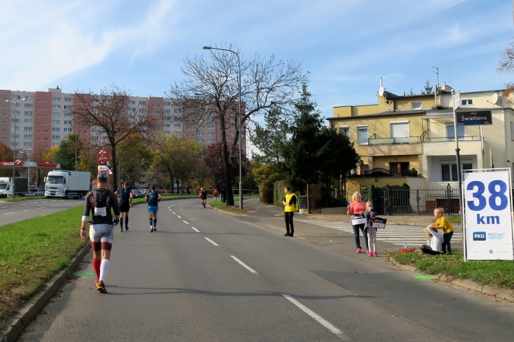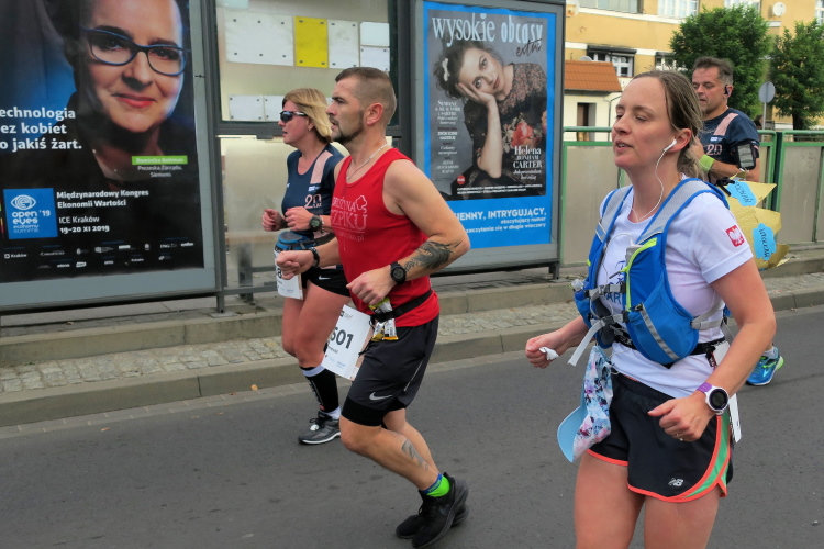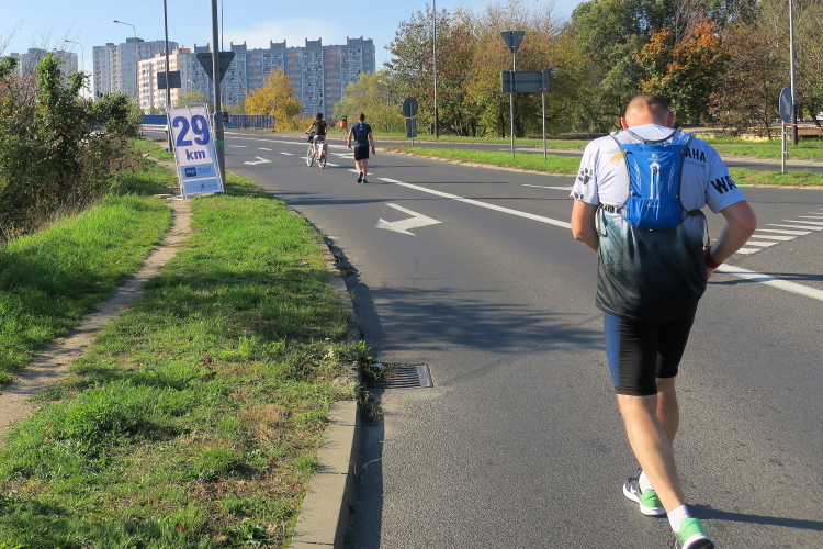 Aber Ausnahmen bestätigen die Regel – Ryszard, gut erkennbar an seinem roten Kopftuch und den giftgrünen Laufsocken, braust mit nach vorne gebeugtem Oberkörper daher, dass man freiwillig Platz macht. Ein paar Wörter Polnisch kann ich und ich sage zu ihm, dass ich aus Wieden (Wien) bin und wie alt „ile lat“ er sei – leider verstehe ich seine Antwort nicht, aber ich gebe ihm 70+. Er lässt im flotten Gehschritt Läufer um Läufer hinter sich. Phänomenal, möchte ich sagen. Bei Kilometer 38 überhole ich ihn dann aber wieder. Er hält inne und fischt sich ein Gelpäckchen aus seinem Gürtel. Kurz darauf schnappt er mich wieder und scheint auf alle anderen Langsamen auf der Strecke zu schimpfen.