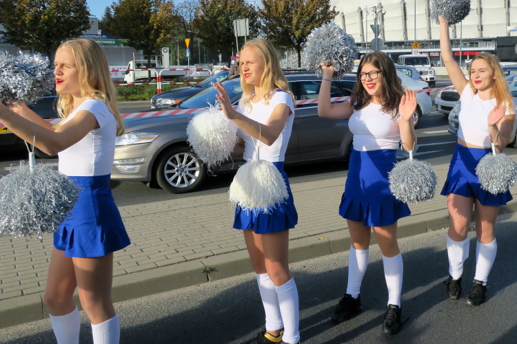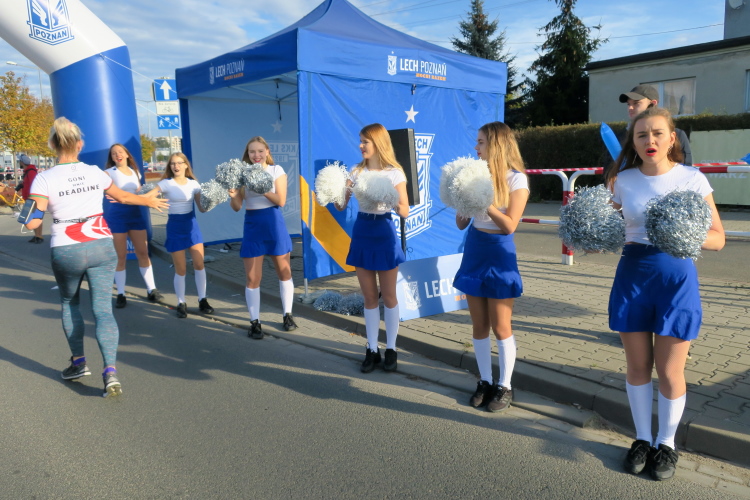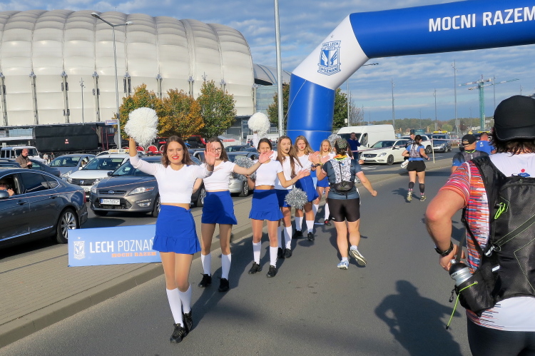 In der Nähe des bereits 1980 eröffneten, durchgehend überdachten Fußballstadions mit einem Fassungsvermögen von ca. 42.000 Zuschauern dreht die Marathonstrecke dann nach Norden. Hier stehen auch zahlreiche Zuschauer, die applaudieren. Das blau-weiße Maskottchen vom wegen seiner Hooligans gefürchteten Fußballclub Lech Posen bekomme ich gut ins Bild.