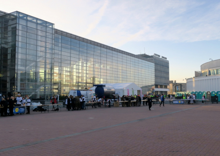 Ich sehe mich auf der Messe ein wenig um: die Fahnen von ca. 30 bis 40 Ländern sind entlang der Wand oberhalb der Nummernausgabestelle aufgezogen. Mittels Zeitraffer wird die Strecke auf einer Videowall gezeigt.