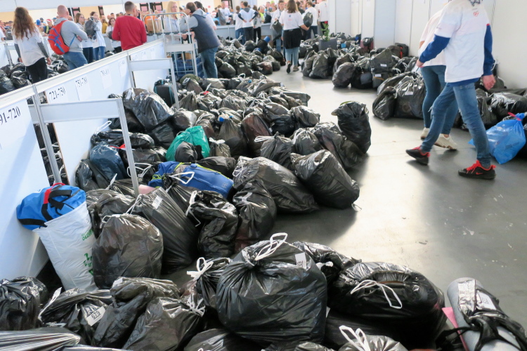 Das Traffic-Hotel bietet an diesem Sonntag ausnahmsweise das Buffetfrühstück schon um 7 Uhr an, so drängen sich nur Läufer in der Früh an der Kaffeemaschine. Wer mir weismachen will, dass man mit einem leeren Magen besser oder schneller laufen kann, dem lasse ich seinen Glauben – so bleibt für mich mehr übrig. Doch heute verweile ich nicht so lange beim Frühstücken, eine gewisse Nervosität spüre ich nämlich auch. Dazu kommt, dass ich nicht so richtig abschätzen kann, wieweit das Startareal tatsächlich von den Messehallen entfernt ist. Ich betrete wieder das Expogelände, in einer riesigen Halle geben viele ihre schwarzen, prall gefüllten Kleideraufbewahrungssäcke ab.