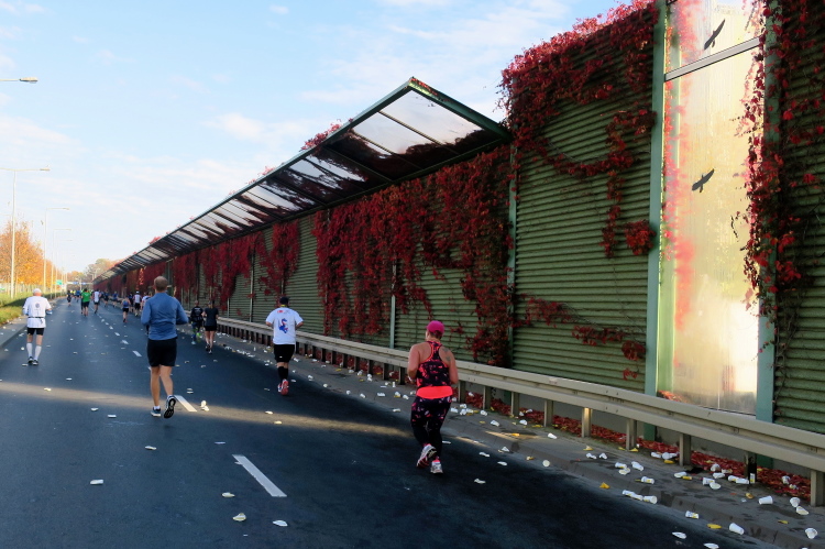 Die Polizei hat alles unter Kontrolle, der Verkehr aus den Querstraßen wird individuell für jeden Läufer bzw. zumeist ja eine kleine Gruppe per Handzeichen angehalten. Ich befinde mich ab Kilometer 32 in einem breiten Strom von langsamen Läuferinnen und Läufern, was bei mehr als 6.000 Personen auf einer nun langgezogenen Strecke zu einer gut sichtbaren Kolonnenbildung geführt hat. Es scheint, dass die Luft sozusagen bei den meisten „draußen“ ist, es wird kaum mehr beschleunigt, man will ins Ziel kommen, das reicht.