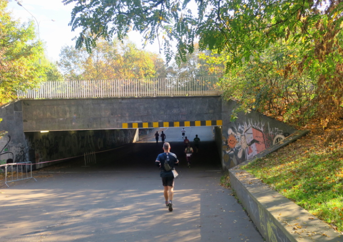 Es geht auf einer Brücke über die darunter verlaufene zweispurige Autobahn. Bei diesem strahlenden Herbsttag ist der Verkehr unter uns stark. Ich entschließe mich, das Langarmshirt auszuziehen. Das 20 Jahre alte Leibchen darunter rückt mich in die Nähe jener im Osten noch manchmal anzutreffenden Läufer, die sich nicht von ihren uralten Laufutensilien trennen können. Mit anderen Worten, mein Leiberl ist so altmodern geschnitten, dass der Retro-Look schon wieder als hip gelten könnte.