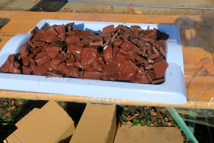 „Lachen ist gesund“, weiß der Volksmund – die Kochschokoladenstücke sind unter der beständigen Sonneneinstrahlung angeschmolzen, das erheitert nicht nur mein Gemüt. In Polen gilt Schoko als Kraftnahrung, das wusste schon vor 40 Jahren „Bubi“, ein pensionierter Direktor der Bank Polski, zu erzählen. Er und seine Frau Irina mit Stiefsohn Tomek nahmen auf ihren Ausflügen zu den Masurischen Seen immer Schokolade mit – das fällt mir ad hoc zum Schokoschmelztiegel ein. Wer jetzt da hineingreift, muss sich anschließend die Hände waschen.