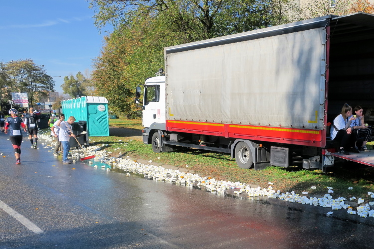 Schon die längste Zeit sehen wir auf der anderen Straßenseite die schnellen Läufer nach der Wende bei Kilometer 6 wieder auf dem Rückweg stadteinwärts. Die Versorgung an der Labe ist üppig, Wasser, Iso, Orangen, auch wieder Kochschokolade – die man aber schlecht kauen kann, es dauert immer solange, bis sie im Mund zergeht. Stani bleibt nicht stehen, ich versuche erst gar nicht, ihm zu folgen.