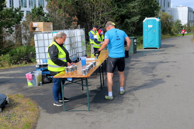 Schon nach 4 km befindet sich die erste Labestelle. Es gibt Powerade, ein Hauptsponsor des Marathons, und Wasser, das aus Plastikwannen in Plastikbecher von Helfern geschöpft wird. Hygienisch mag das nicht sein, aber ökonomisch.